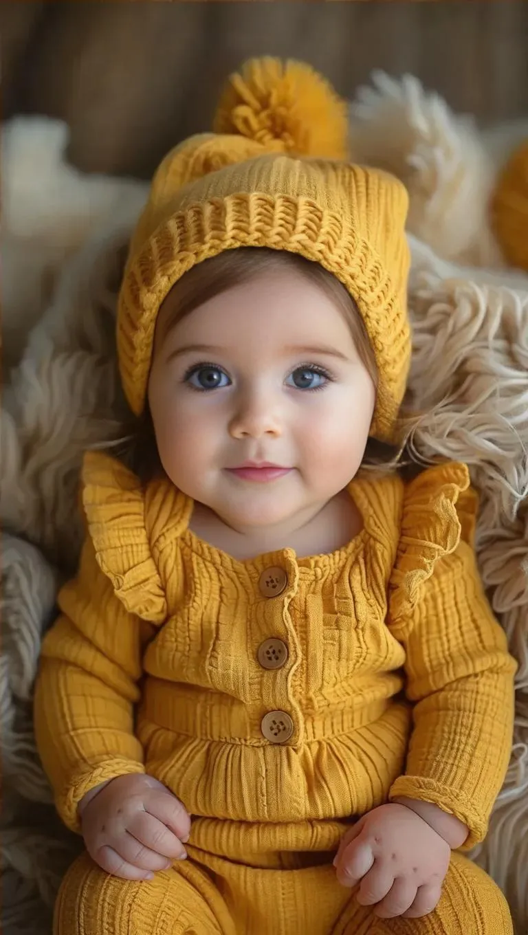 Generate a lifelike, full-body image of a cute baby girl in a vibrant yellow outfit using AI. Transform text prompts into realistic, detailed visuals with VivaGo.ai's advanced creative tools for professional-grade, heartwarming results.