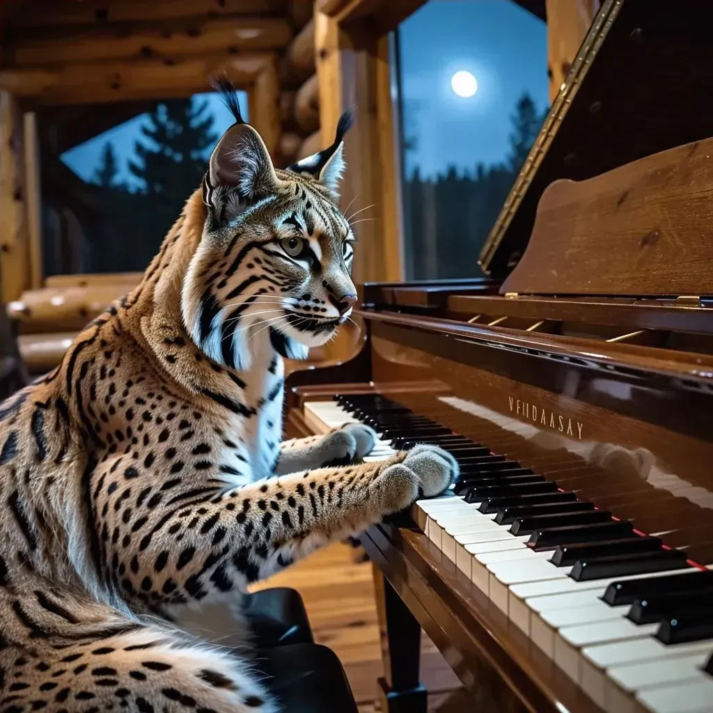 Create a whimsical AI-generated image of a bobcat playing the piano with vivago.ai. Explore anthropomorphic wildlife art and AI music-themed visuals. Transform text prompts into playful digital masterpieces blending nature, creativity, and unexpected talent using advanced AI image generation tools.