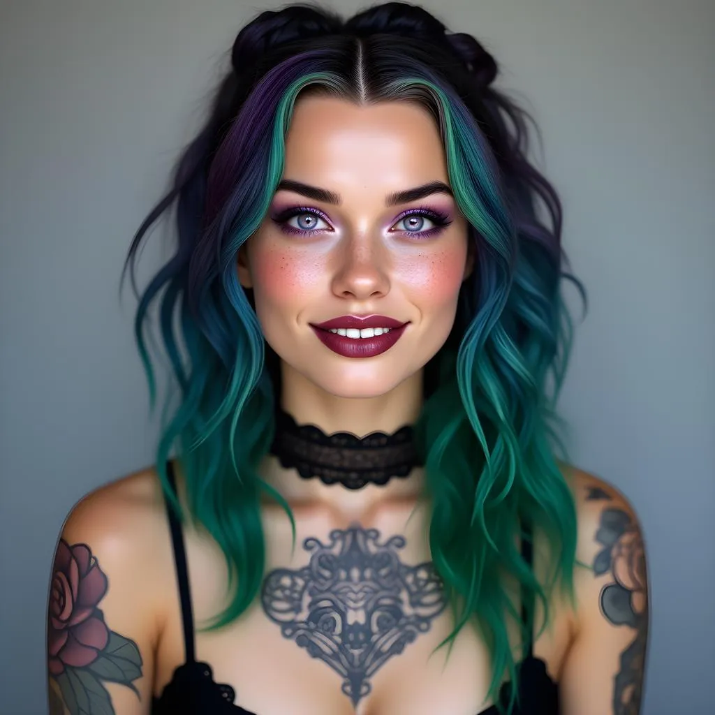 Create stunning AI-generated portraits of a young adult woman with bold black-green hair, intricate goth tattoos, and piercing purple eyes. Perfect for vibrant, hyper-detailed visuals featuring dark makeup, freckles, and a radiant smile. Elevate creativity with VivaGo.ai’s advanced AI tools for professional, high-quality, and realistic portrait artistry.