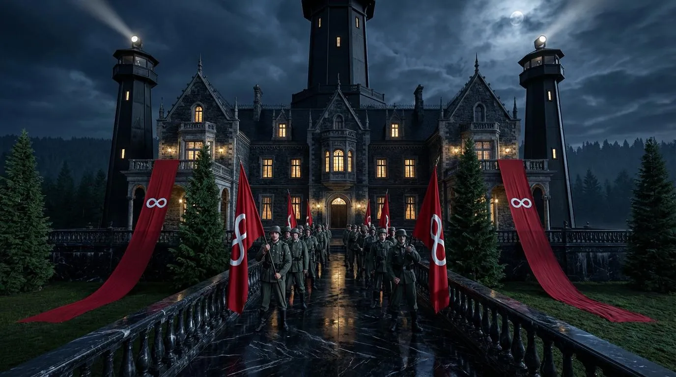 Create stunning AI-generated night scenes of a Gothic infinity mansion with dramatic red canvases, towering black spires, and searchlights. Generate images featuring a company of 1940s German soldiers on wet marble walkways amidst fluttering infinity flags. Design your own haunting, atmospheric visuals with Vivago.ai's powerful image generation tools.