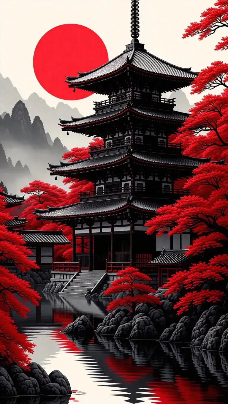 Pastel shallow red, deep black, grays and bright whites Japan ornate old japan depicted in surreal ancient Japanese architecture. Made on scrolls in ancient Japan with essence of a mystical past.
