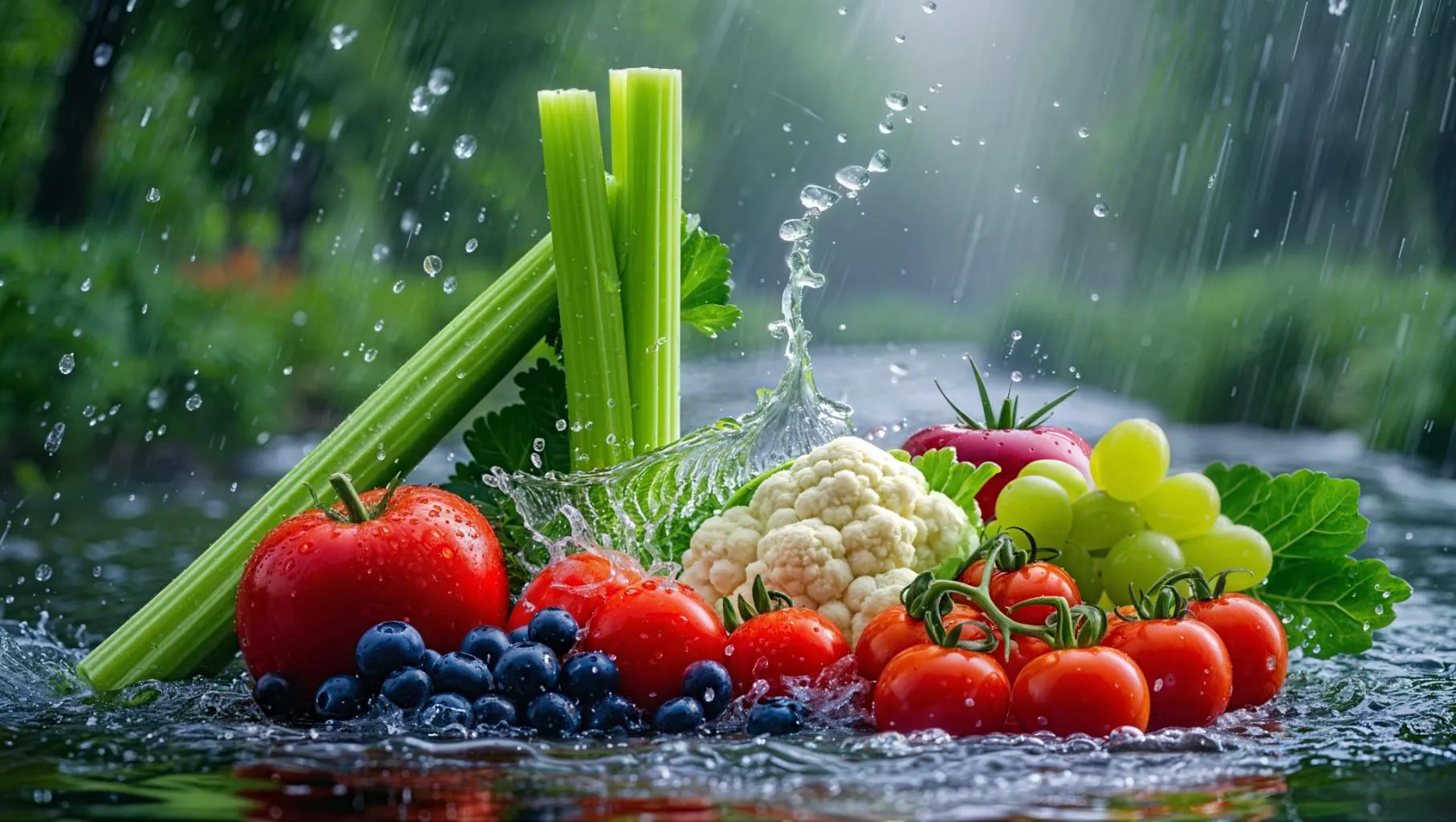 Create stunning AI-generated macro photography with vibrant food close-ups, splashing water, and natural elements. Highlight details of celery, tomatoes, grapes, and apples using telephoto lens effects, natural lighting, and HD clarity. Perfect for dynamic food visuals with misty ambiance and rich textures. Elevate your content with vivago.ai’s professional AI tools.