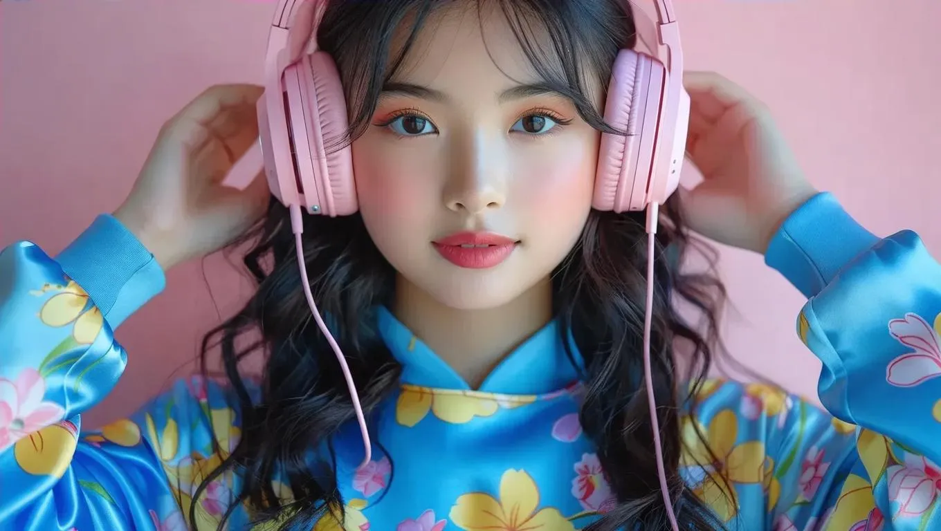 Generate vibrant AI visuals of an Asian girl with black wavy hair, pink-white headphones, and a flowy blue outfit featuring yellow floral patterns using vivago.ai. Transform text prompts into anime-inspired character art with professional-grade AI effects and customizable editing tools.