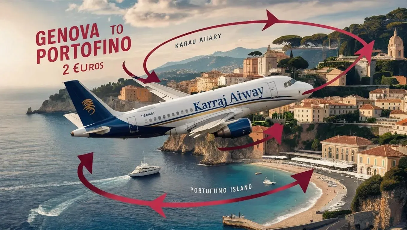 Generate a vibrant map image from Genova to Portofino Island with **Karaj Airway** arrows marking the air route, featuring a bold airplane graphic. Title highlights "Genova to Portofino 2 Euros" for budget travel appeal. AI-powered design ensures professional visuals, blending precise geography with creative travel inspiration. Perfect for promotional content or itinerary visuals.