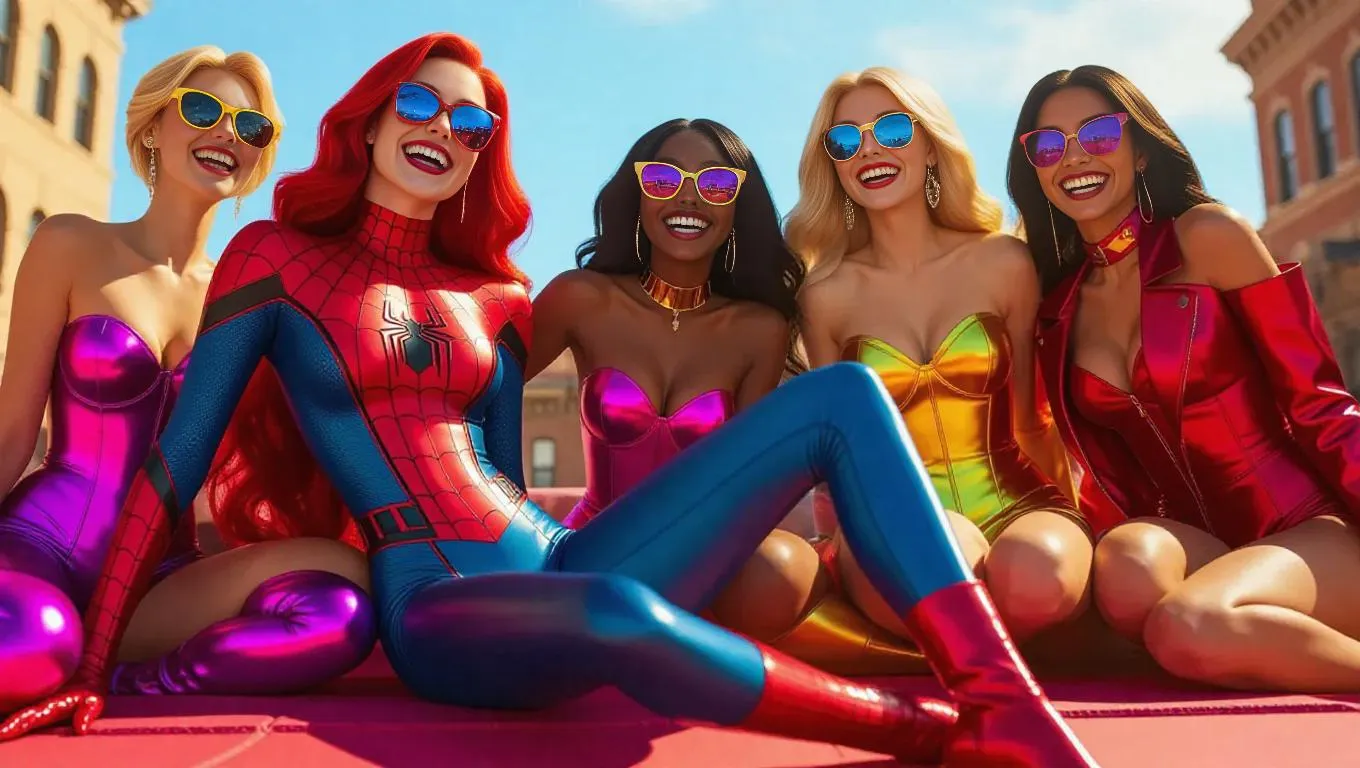 A playful and cheeky scene featuring Spider-Woman in a sleek, form-fitting suit, lounging casually with Wonder Woman and iconic Disney Princesses (Ariel, Belle, Rapunzel) on a vibrant rooftop. Bright, sunny day with bold, colorful decor. Group laughing, teasing, striking fun, confident poses, exuding flirty, mischievous vibes. Stylish, modern outfits with sunglasses, boots, jackets. Bold, feminine, carefree atmosphere, mixing superhero power with princess charm.