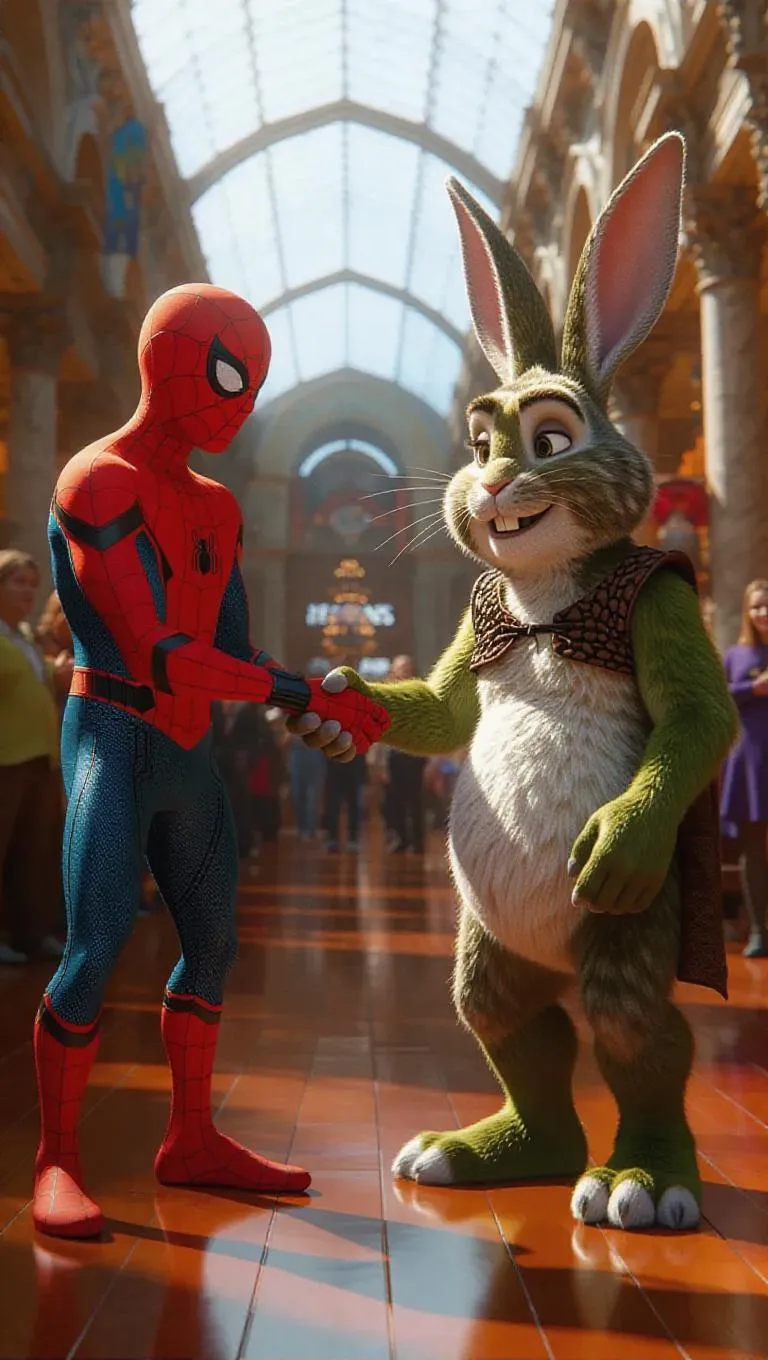 Generate a photorealistic AI image of Spiderman shaking hands with Bugs Bunny, Dumbledore nodding approvingly, and Shrek in a detailed mall backdrop. Explore AI-powered crossovers, surreal character interactions, and hyper-realistic scenes with Vivago.ai's advanced image generation tools for creative visuals, pop culture mashups, and professional editing effects.