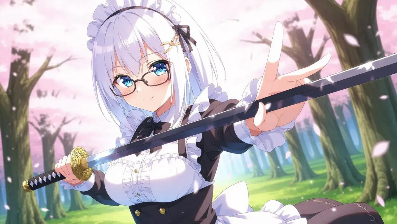 Create stunning AI-generated anime art with Vivago.ai. Design a white-haired maid warrior with bleeding eyes, blue pupils, and pink-white skin wielding a katana. Generate dynamic water breathing effects against demons in a mystical forest. Perfect lighting, falling cherry blossoms, and Demon Slayer-style combat scenes. Custom AI anime character creation with vibrant visuals and professional editing tools.