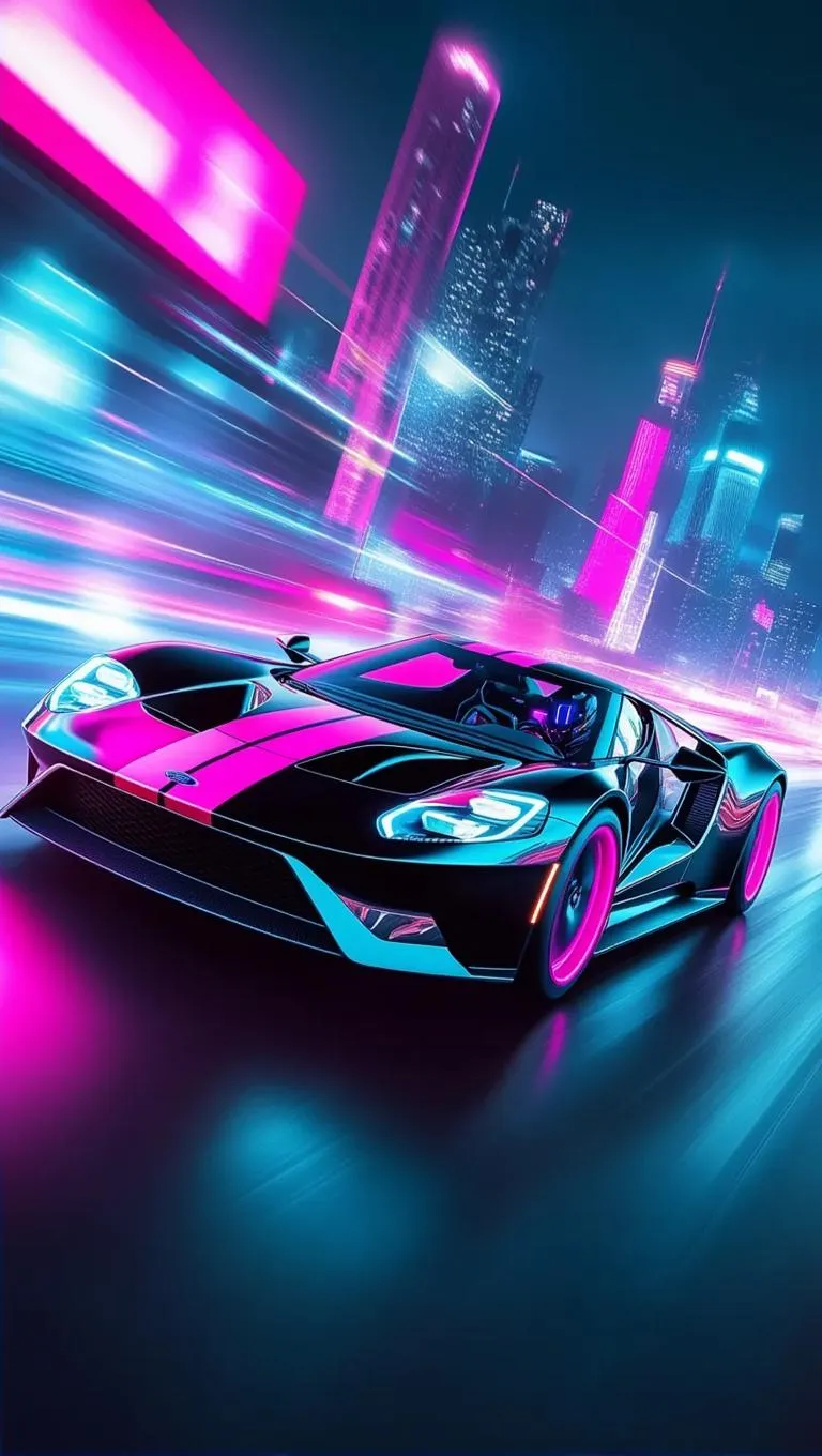 Generate cyberpunk-style AI visuals of a sleek Black Ford GT with a futuristic driver, blending neon-lit streets and dystopian backdrops. Explore AI effects for high-octane automotive art, transforming text prompts into dynamic, professional-grade cyberpunk imagery with cutting-edge editing tools.