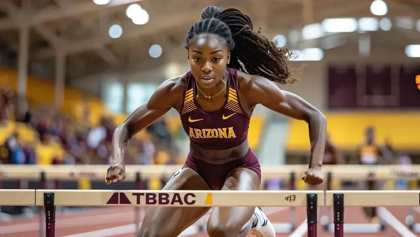 AI-generated sports visuals of a dark-skinned Arizona State athlete smashing the NCAA indoor 60m hurdles record (7.93s). Dynamic AI-powered imagery captures her record-breaking sprint, hurdles, and victory for sports creators. Perfect for athletics promotions, sports blogs, or highlighting AI-generated track & field action.