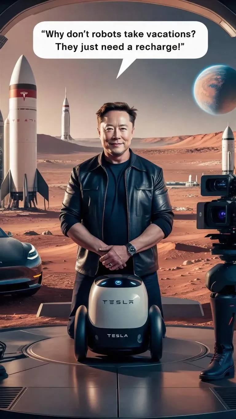 Generate a humorous Elon Musk parody video with AI, blending rockets, electric cars, and Mars landscapes. Watch a Tesla bot reboot mid-joke in this futuristic scene, combining witty AI dialogue with vivid AI-generated visuals. Perfect for tech humor and sci-fi enthusiasts seeking dynamic, AI-powered creativity.