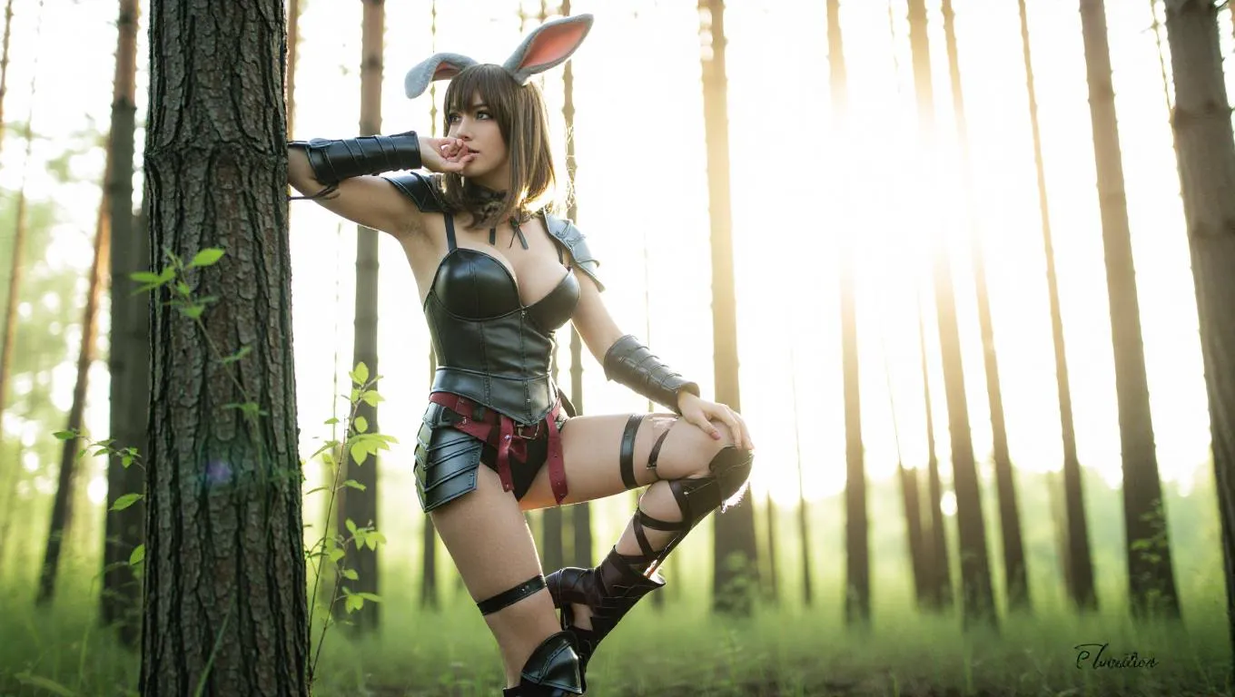 score_9, score_8_up, score_7_up, female, furry, bunny, skimpy, wearing leather armor, hunter, against tree, sexy pose, forest, medieval fantasy, dynamic angle, highly detailed, high contrast, film grain, superabsurd res, 8k