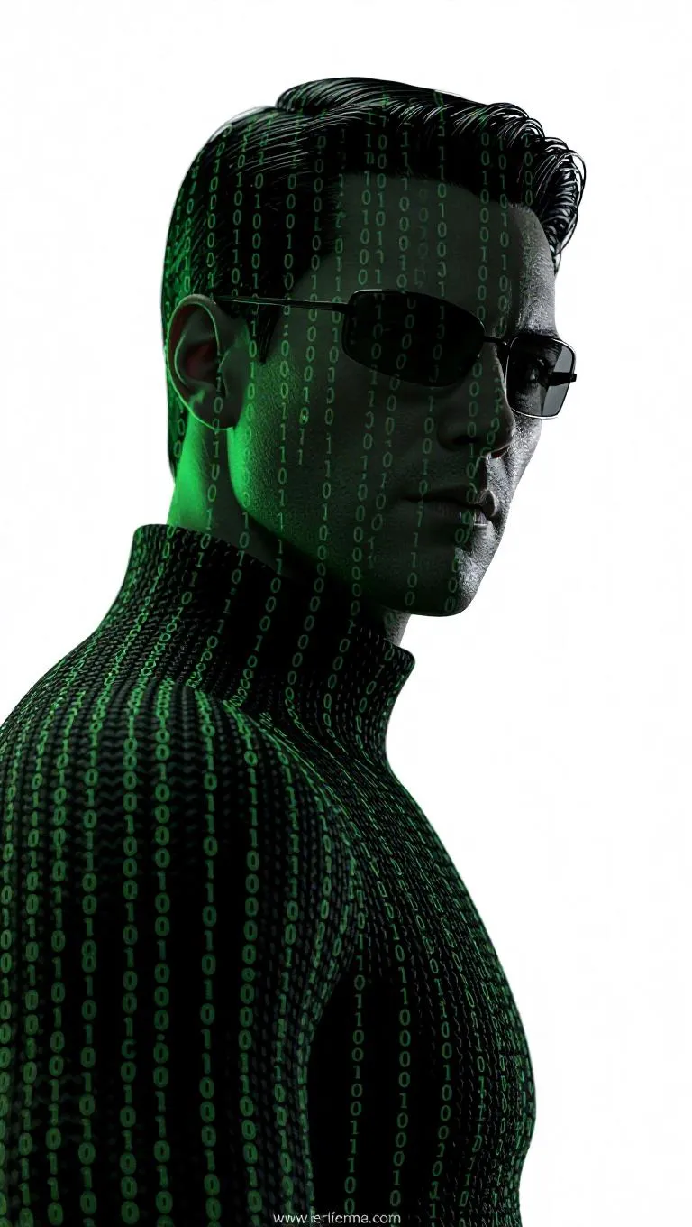 Neo floats in a dimensional rift, surrounded by flowing code streams and matrix afterimages, the internal structure like a maze of numbers. Neo's eyes reflect the green glow of the code. Thick brush strokes highlight the texture of Neo's wool suit and the digital flow. Suit material from Substance library, code flow with IES light source. Rendering sampling >5000, ambient light 2000 K, code light 8000 K. Strokes align with code flow, blending mode linear plus light. No cartoon characters, no natural landscapes, no geometric abstraction.