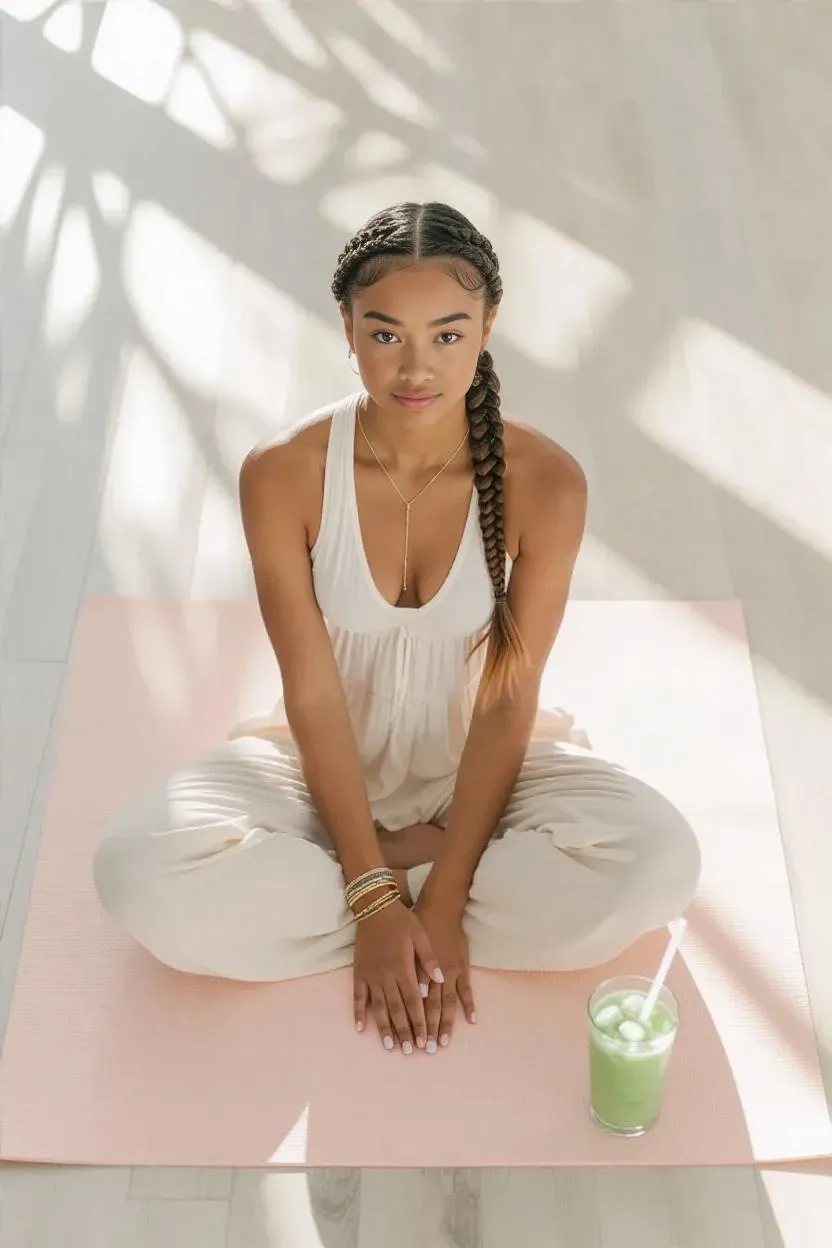 Capture mindful serenity with a light-skinned woman in a yoga pose on a pink mat. Natural lighting enhances muted beige, gray, and white tones. Clean composition features a high-angle view, iced drink, and uncluttered aesthetic for calm relaxation and wellness imagery.
