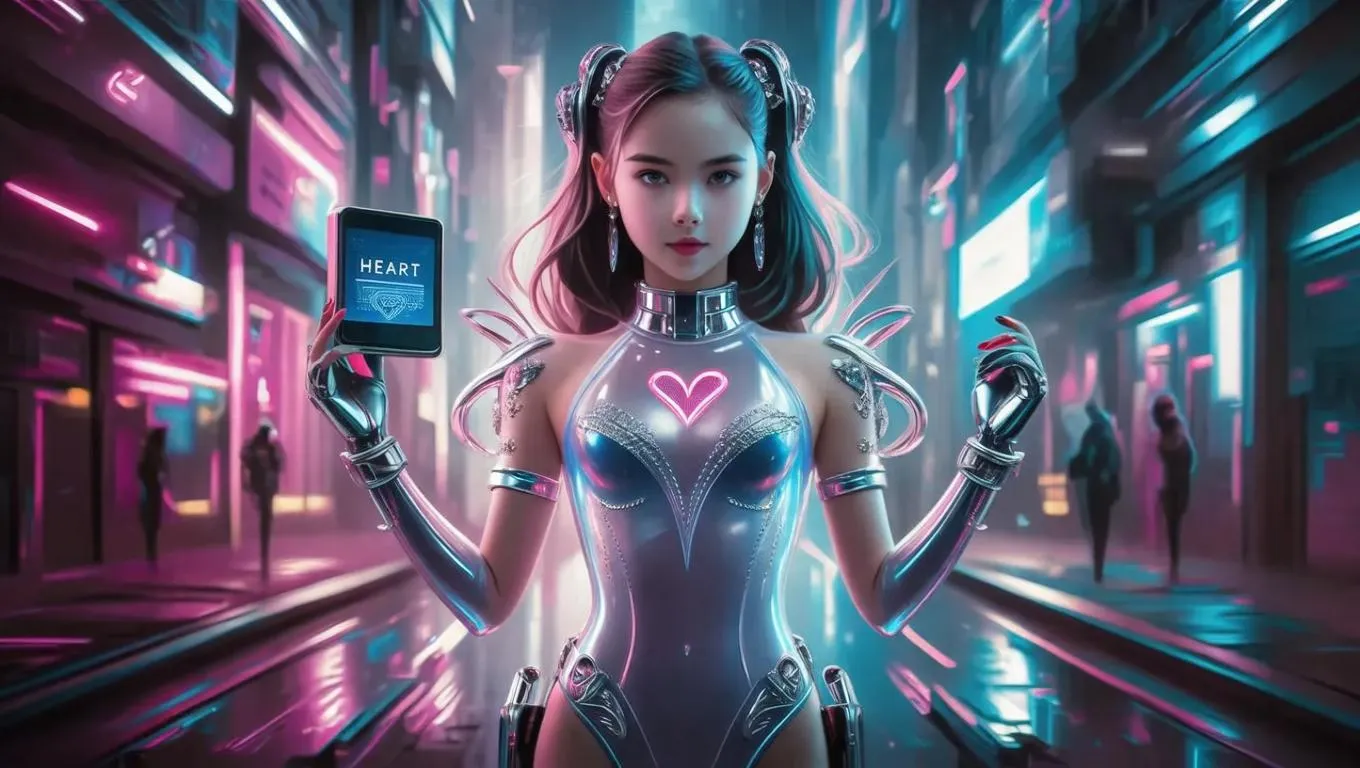 Cyberpunk portrait of an elegantly futuristic girl in a sleek transparent bodysuit with chrome accents, set against a neon-lit cityscape. AI-generated visuals showcase intricate designs, vibrant colors, and crystal-clear details for maximum impact. Craft stunning cyberpunk art with vivago.ai's AI image tools, transforming prompts into professional-grade visuals.