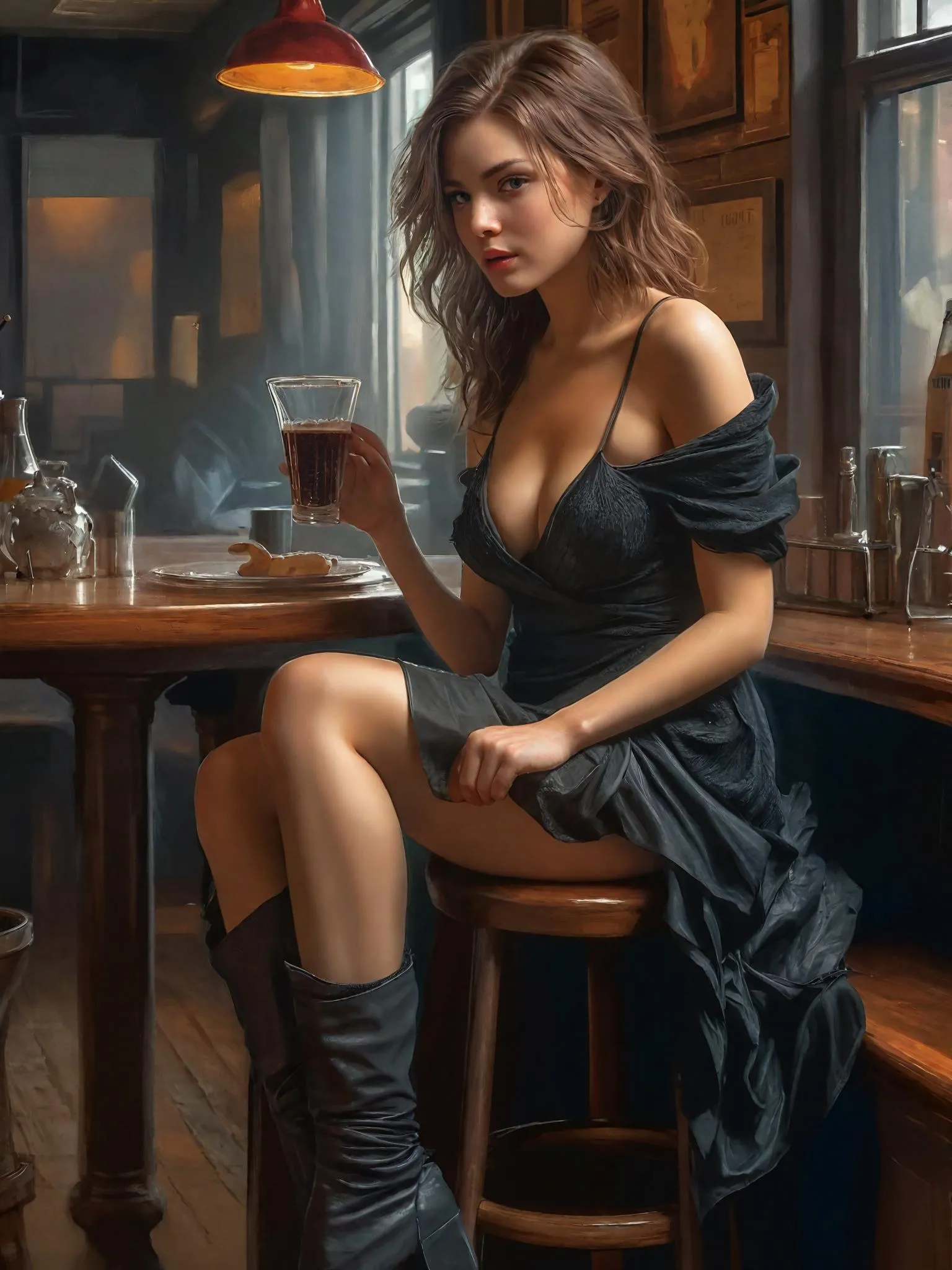 Transform your vision into cinematic AI art with Vivago. Experience a contemplative scene of a young woman in a black off-shoulder dress at a rustic bar counter with vintage apothecary details. Soft, warm lighting enhances her wistful expression and realistic detail. Generate this evocative, detailed realism effortlessly.