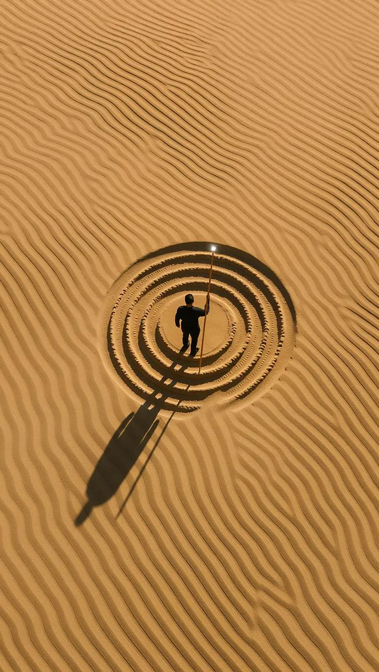An overhead view of vast dunes marked by a single, precise spiral trail left by a desert creature. At the spiral's center, a person stands holding a long staff that glints in the sunlight. The scene is devoid of architecture, featuring only the interplay of geometry, light, and shadow. The person’s silhouette is razor-sharp against the undulating dunes, which resemble waves in a kinetic painting. The image exudes artful minimalism with a symbolic structure, emphasizing the stark beauty of the desert landscape.