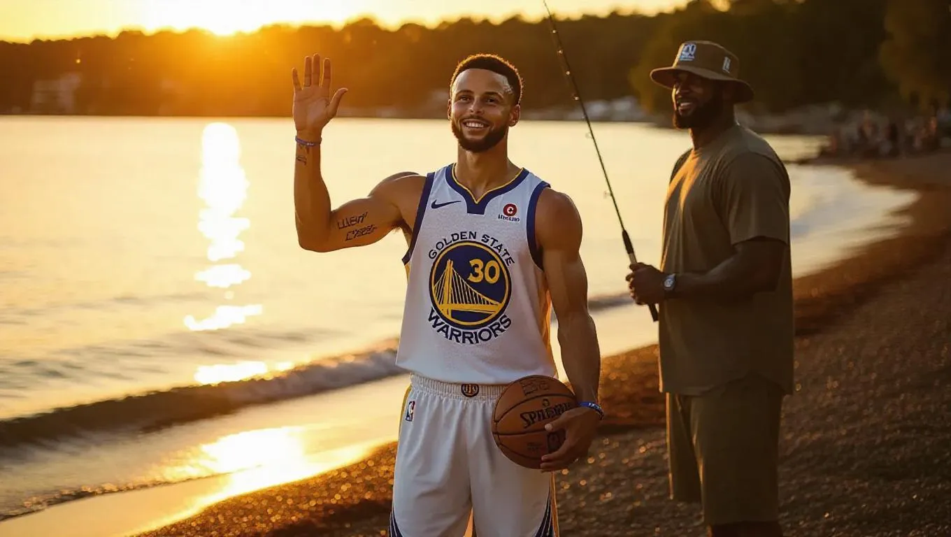 AI-generated image of Stephen Curry waving farewell in a golden sunset lakeside scene, wearing a Warriors jersey with a basketball. LeBron James contrasts with fishing gear, embodying relaxed resignation. Nostalgic summer atmosphere with soft volumetric lighting, muted gold tones, and detailed textures. Transform text to visuals using vivago.ai's AI tools for professional-grade creative results.