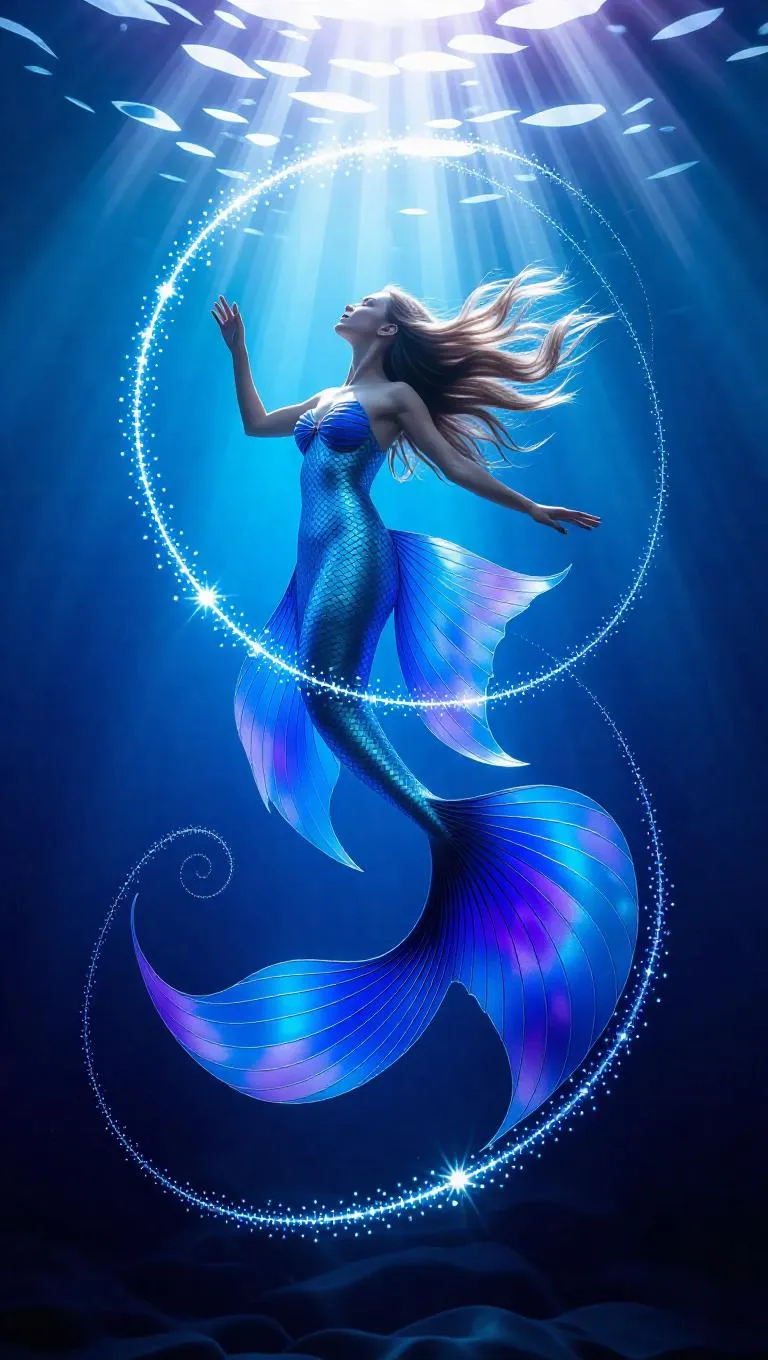 Deep in enchanted waters, a mermaid performs an elegant dance, her pearlescent tail shimmering with aquamarine and violet hues. Surrounded by a spiral of magical bubbles and ethereal light beams, her flowing hair creates graceful patterns in the crystalline depths. Soft watercolor effects blend seamlessly with sparkling particles, creating a dreamy underwater ballet that captures the mysterious beauty of ocean magic.