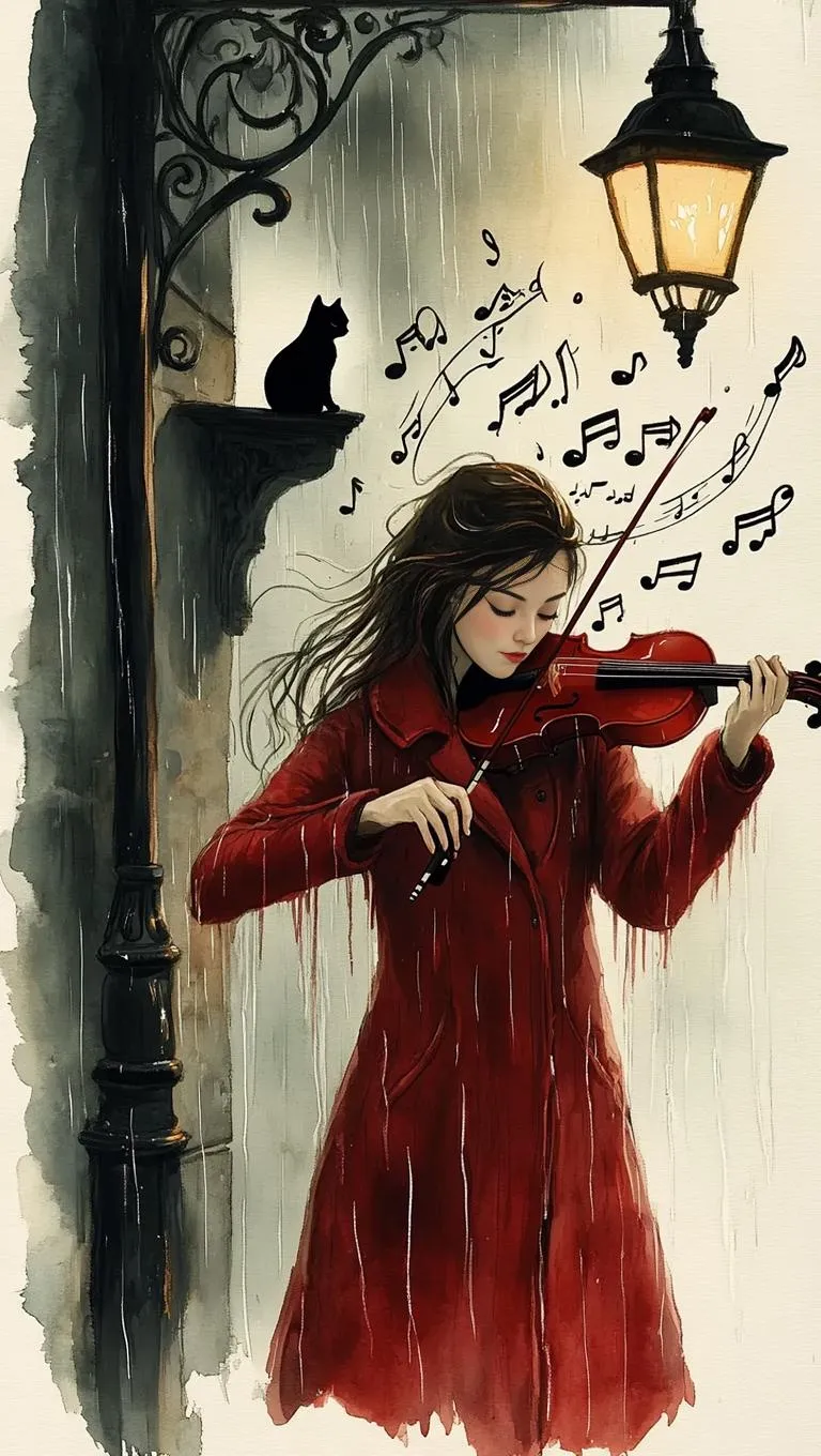 Immerse in a cinematic anime watercolor scene where a violinist in a red coat conjures glowing ink ribbons under a flickering streetlamp. Rain-soaked melancholy meets chiaroscuro lightplay, with a watchful black cat and expressive brushwork fading into ethereal shadows. AI-powered artistry brings spellbinding emotion to life.
