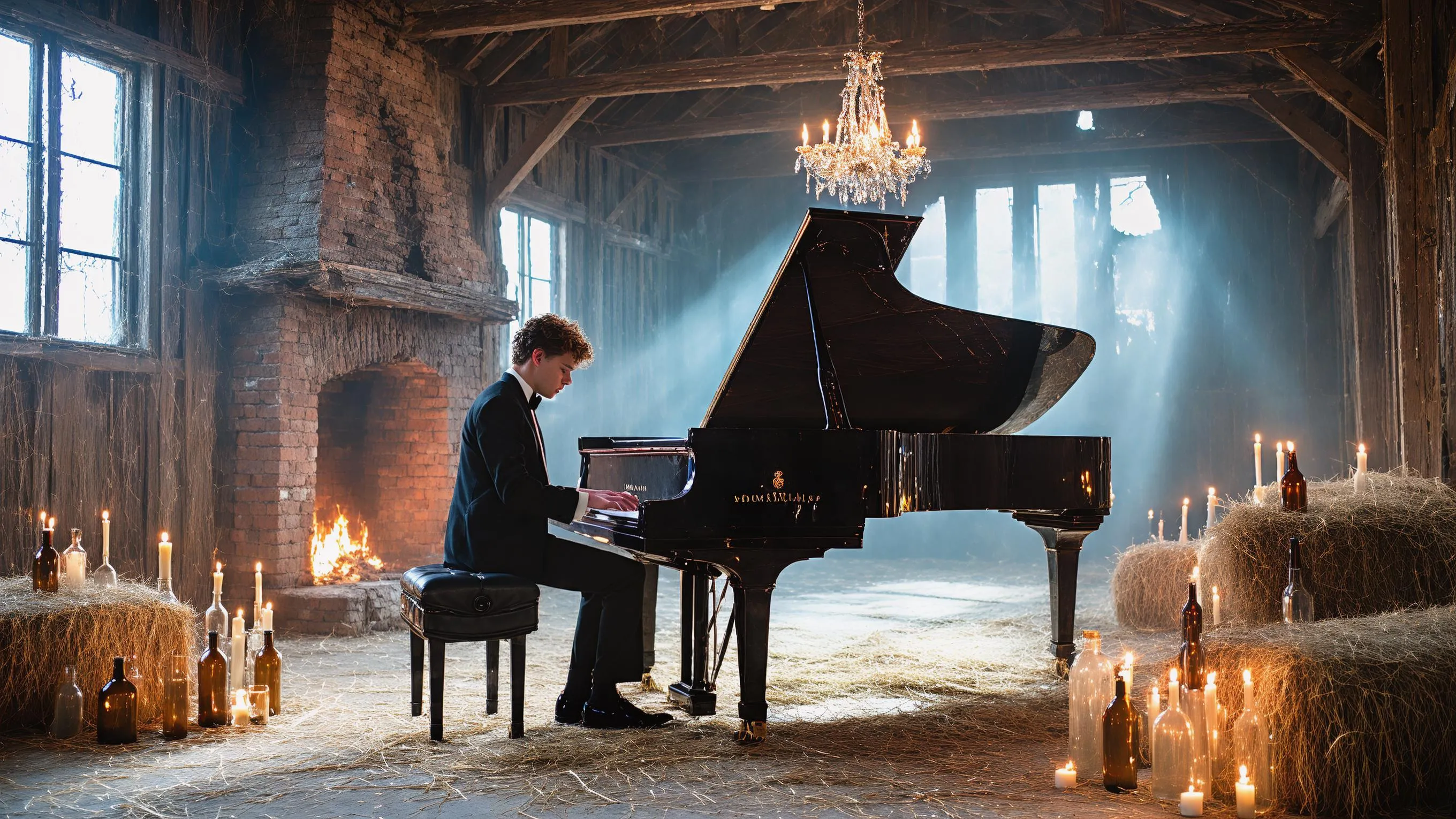 Generate AI images of an elegant pianist passionately performing in a moonlit, ruined barn. Create dramatic scenes with a grand piano, cracked concrete, scattered hay, broken windows, and flickering candlelight. Vivago.ai transforms your vision into stunning AI art with atmospheric effects.