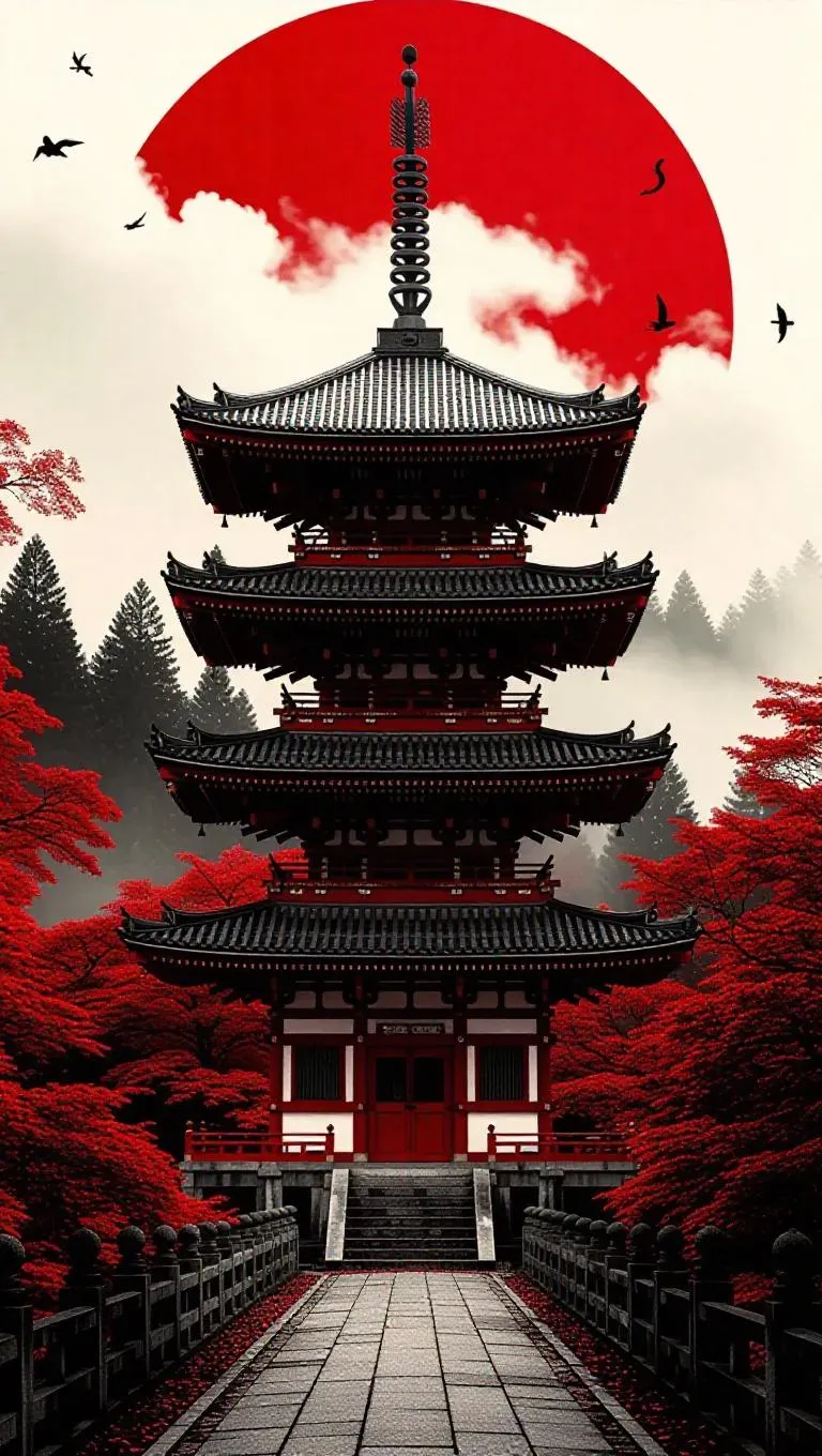 Pastel shallow red, deep black, grays and bright whites Japan ornate old japan depicted in surreal ancient Japanese architecture. Made on scrolls in ancient Japan with essence of a mystical past.