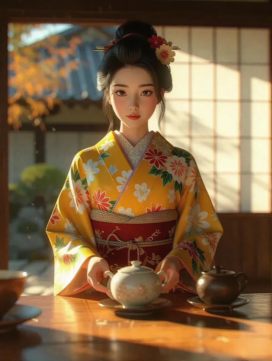 Create AI-generated visuals of an anthropomorphized lemon lady in a traditional Japanese kimono brewing tea, blending whimsical charm with cinematic depth. Explore vibrant textures, modern sneaker contrasts, and soft-blurred traditional house backdrops—crafted with AI precision for surreal, serene scenes that merge natural beauty and creative innovation.