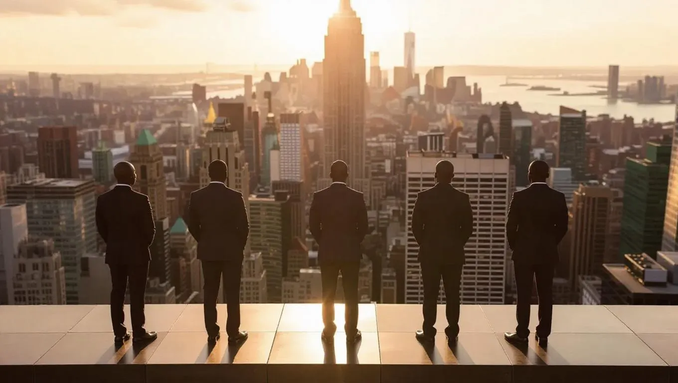 Diverse group of Black men of all ages standing on a skyscraper ledge, gazing over a sprawling cityscape. Serious, contemplative expressions capture an introspective moment of decision-making. AI-generated image tool brings this dramatic urban scene to life, highlighting resilience and strategic planning with striking visuals. Explore creativity with Vivago.ai.