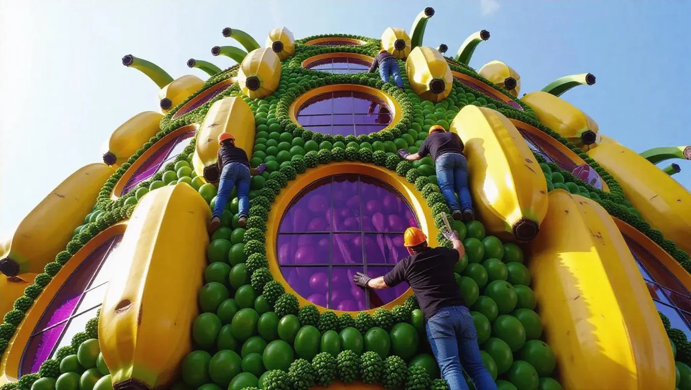 Generate a surreal AI cityscape where skyscrapers morph into colossal bananas with speckled windows, grape-cluster athletic towers, and spiky dragonfruit structures. Workers scale fruit facades, polishing vibrant surfaces in this whimsical metropolis. Perfect for surreal digital art, advertising visuals, or fantasy worldbuilding using AI image generation tools for imaginative, hyper-detailed results.
