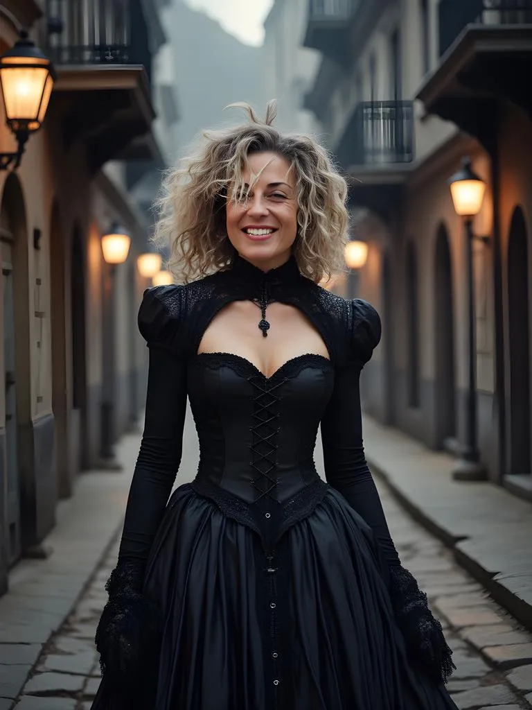 Generate a striking AI image of a beautifully dressed gothic woman wandering eerie, scary streets. Explore dark fashion visuals and haunting urban atmospheres with vivago.ai's AI effects and editing tools for professional-grade creative results.