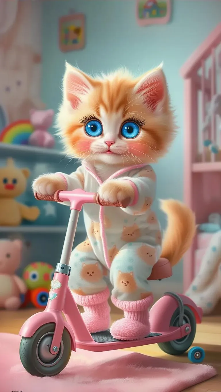 Create an adorable AI-generated image of a tiny orange kitten with blue eyes, blush, and cartoon charm in photorealistic detail. Featuring a cozy children's room backdrop, cute pajamas, slippers, and a pink scooter, this AI photo effect combines playful whimsy with professional-grade visuals. Perfect for heartwarming content using Vivago.ai's creative AI tools.