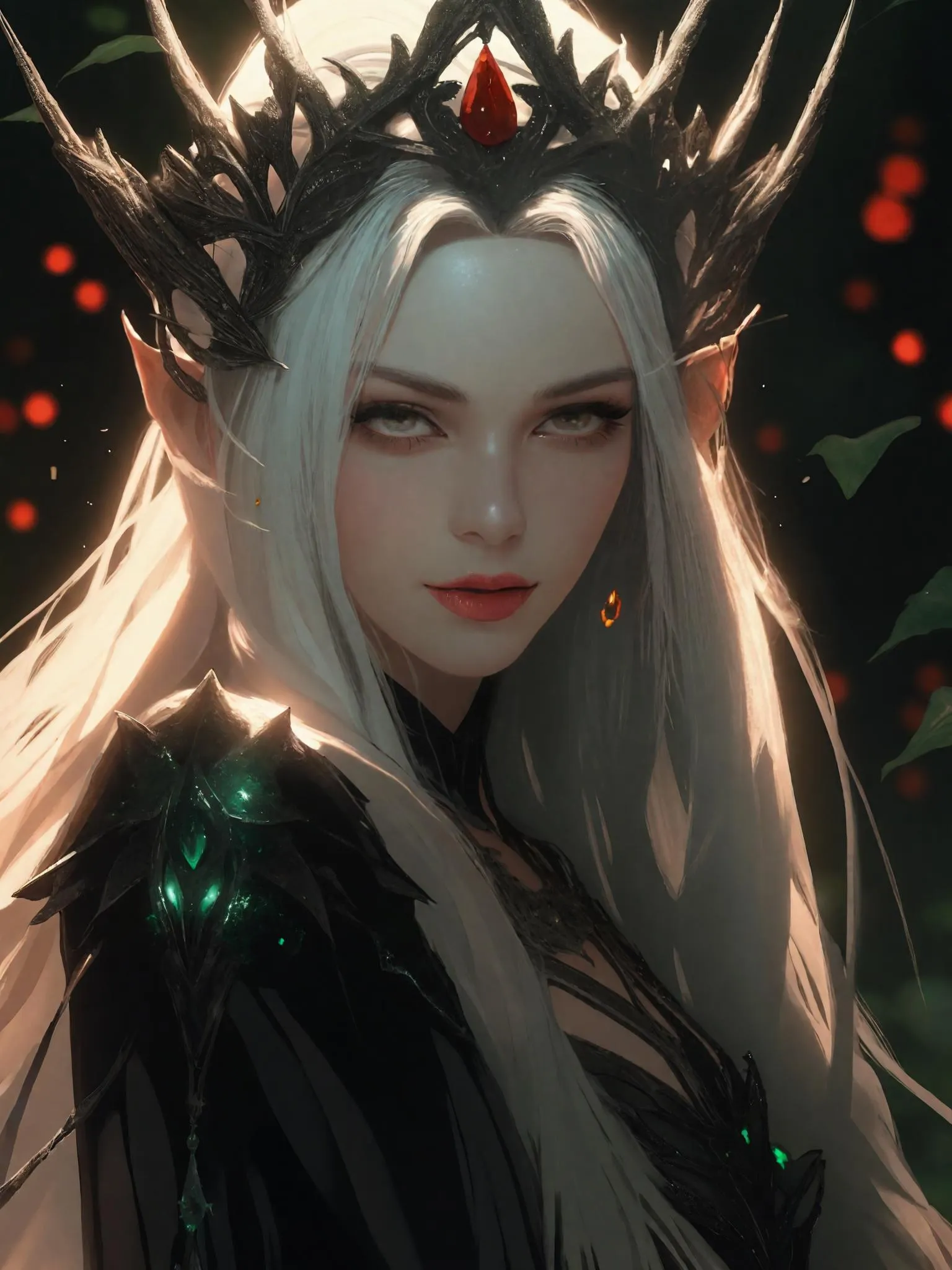 Enchanting anime-style elf with radiant red eyes, flowing white hair, and a shimmering leaf-inspired dress glows in a mystical forest. Emerald crown and high-definition details contrast with dark, ethereal ambiance. Perfect for anime fans seeking vivid, magical character art with luminous textures and AI-generated precision. #AnimeArt #ShinyHair #FantasyDesign