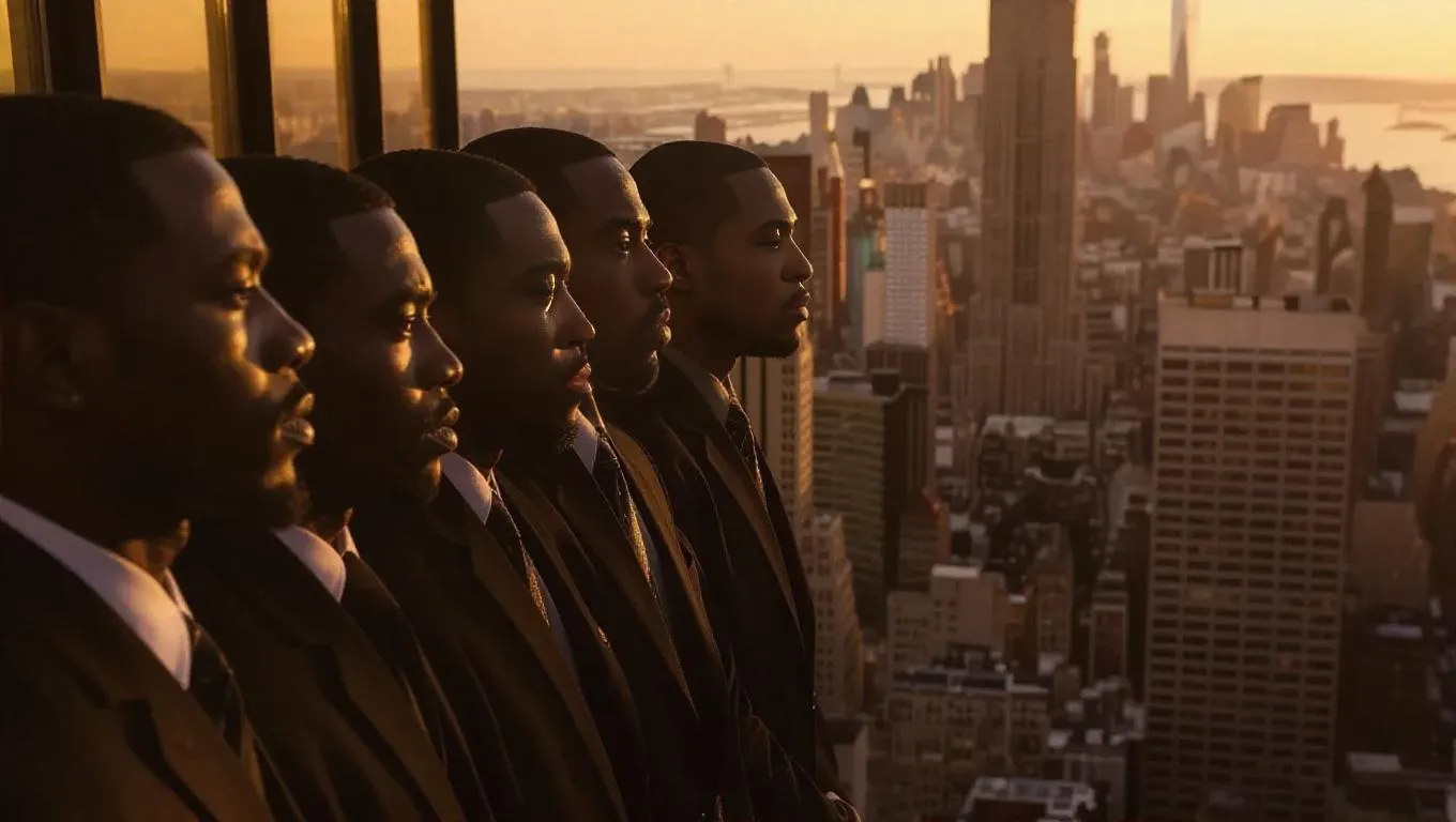 Diverse group of Black men of all ages standing on a skyscraper ledge, gazing over a sprawling cityscape. Serious, contemplative expressions capture an introspective moment of decision-making. AI-generated image tool brings this dramatic urban scene to life, highlighting resilience and strategic planning with striking visuals. Explore creativity with Vivago.ai.