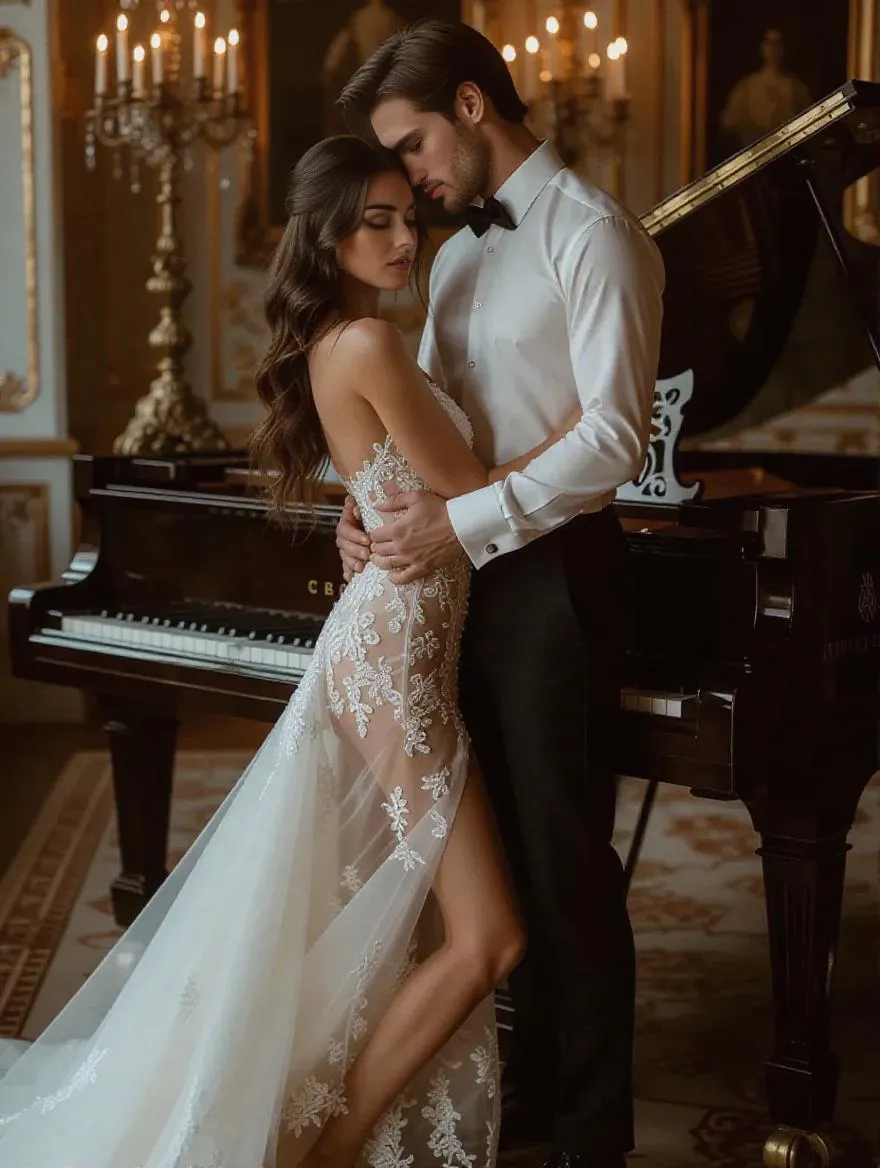 Transform text into stunning cinematic imagery with our AI generator. Create photorealistic romantic couple photos at a grand piano. Experience elegant candlelit rooms, intricate dresses, and soft ambient lighting. Generate 4K masterpiece visuals capturing intimate moments in richly detailed, antique-decorated settings. Craft professional-grade AI images with atmospheric realism.