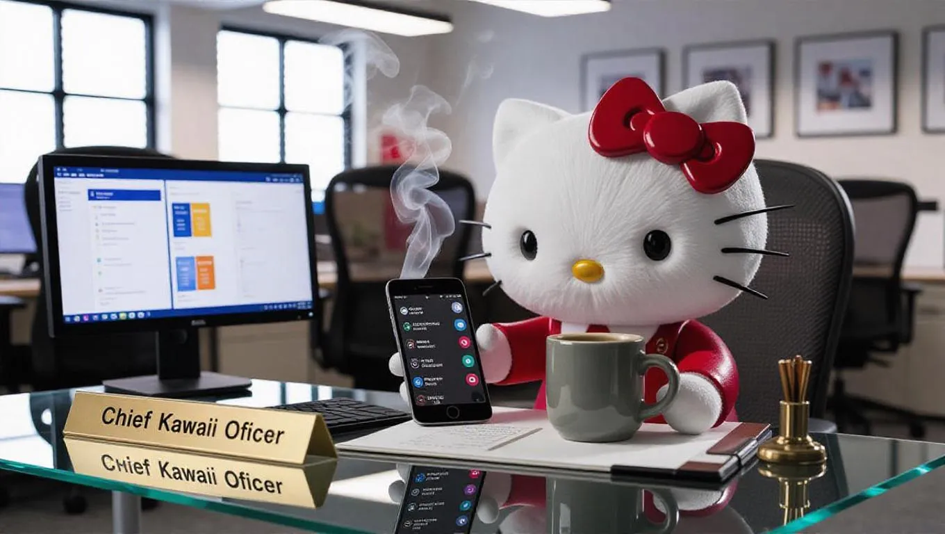 Ultra-realistic AI-generated image of Hello Kitty as "Chief Kawaii Officer" in a hyper-detailed corporate setting: ceramic fur, Slack smartphone, steaming coffee mug, dual monitors with data reflections, and golden nameplate. Professional studio photography style with 85mm f/1.4 realism, diffused LEDs, and macro details. Transform concepts into lifelike visuals via vivago.ai's advanced AI creative tools.