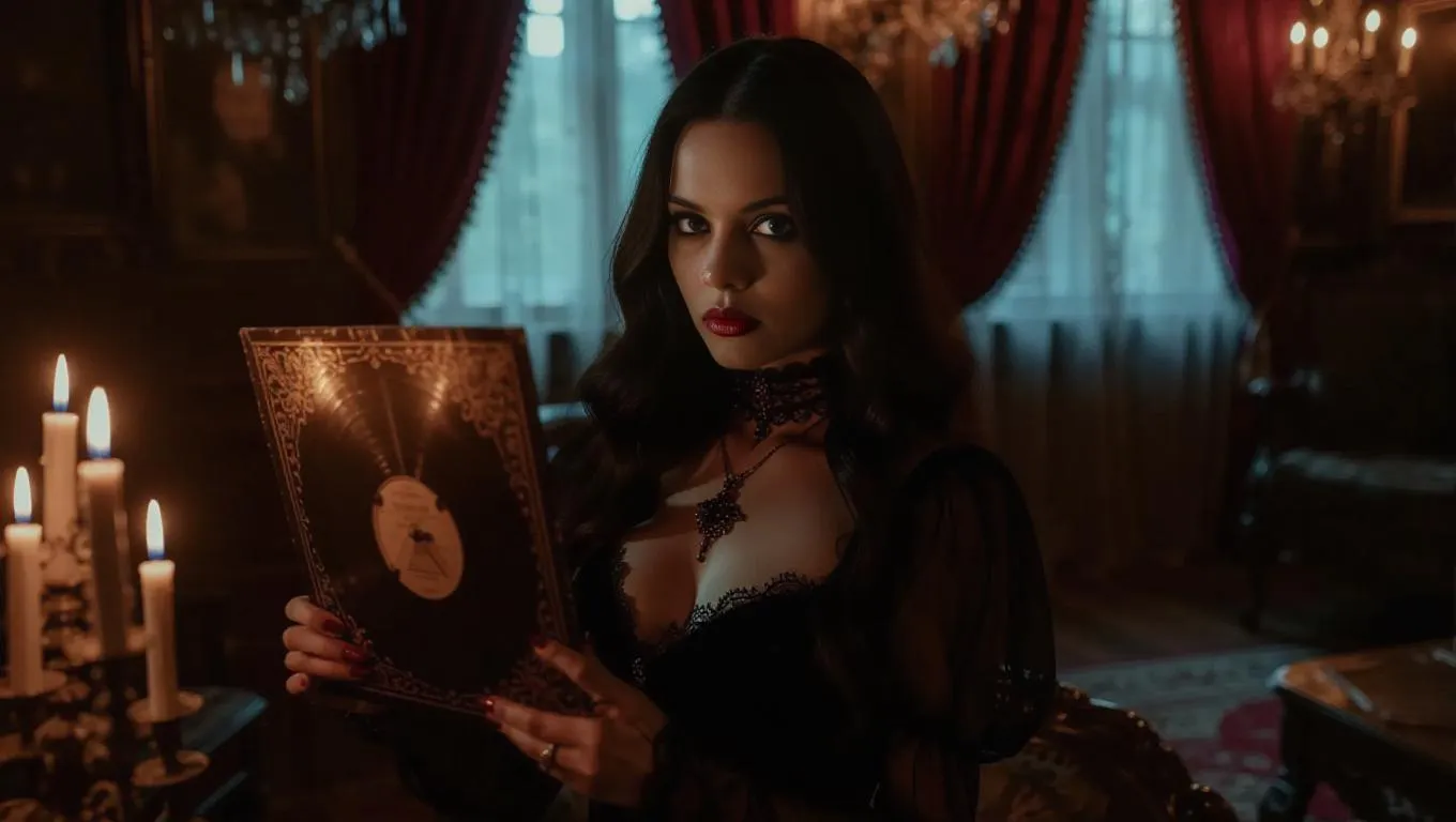 Create captivating AI-generated visuals of a female vampire holding a vinyl album cover with vivago.ai. Transform text prompts into supernatural-themed artwork, retro-inspired designs, and professional music visuals using advanced AI image tools for striking creative results.