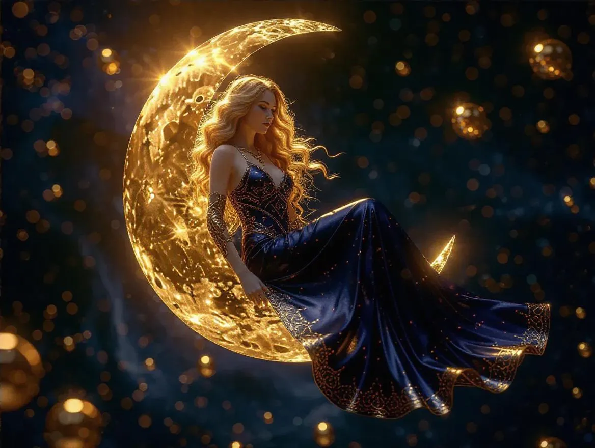 Celestial goddess seated on a liquid gold crescent moon, flowing golden hair in zero gravity. Ethereal dark blue dress with crimson accents, cosmic starry backdrop, glowing golden orbs. Hyper-detailed fantasy art with surreal luminous textures, golden hour lighting, intricate curls. Transform text prompts into mesmerizing AI-generated visuals with VivaGo's advanced style options.