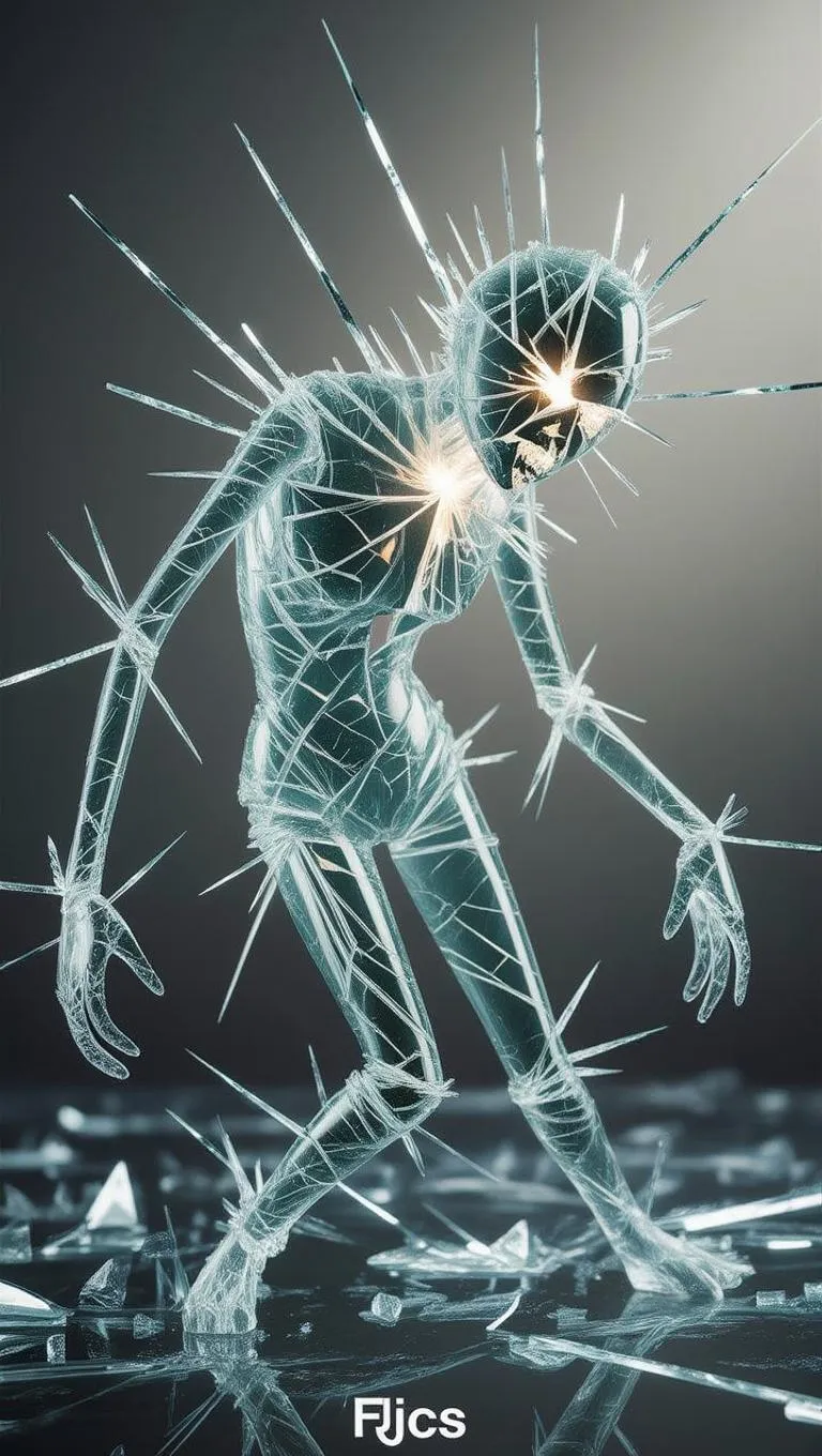 Generate striking AI visuals of a crystalline glass entity with glowing violet fractures in a dystopian wasteland. Explore fragile yet menacing textures, dynamic motion effects, and ethereal color palettes using advanced AI image generation tools for surreal, unstable energy aesthetics. Perfect for concept art, sci-fi themes, and experimental digital creations.