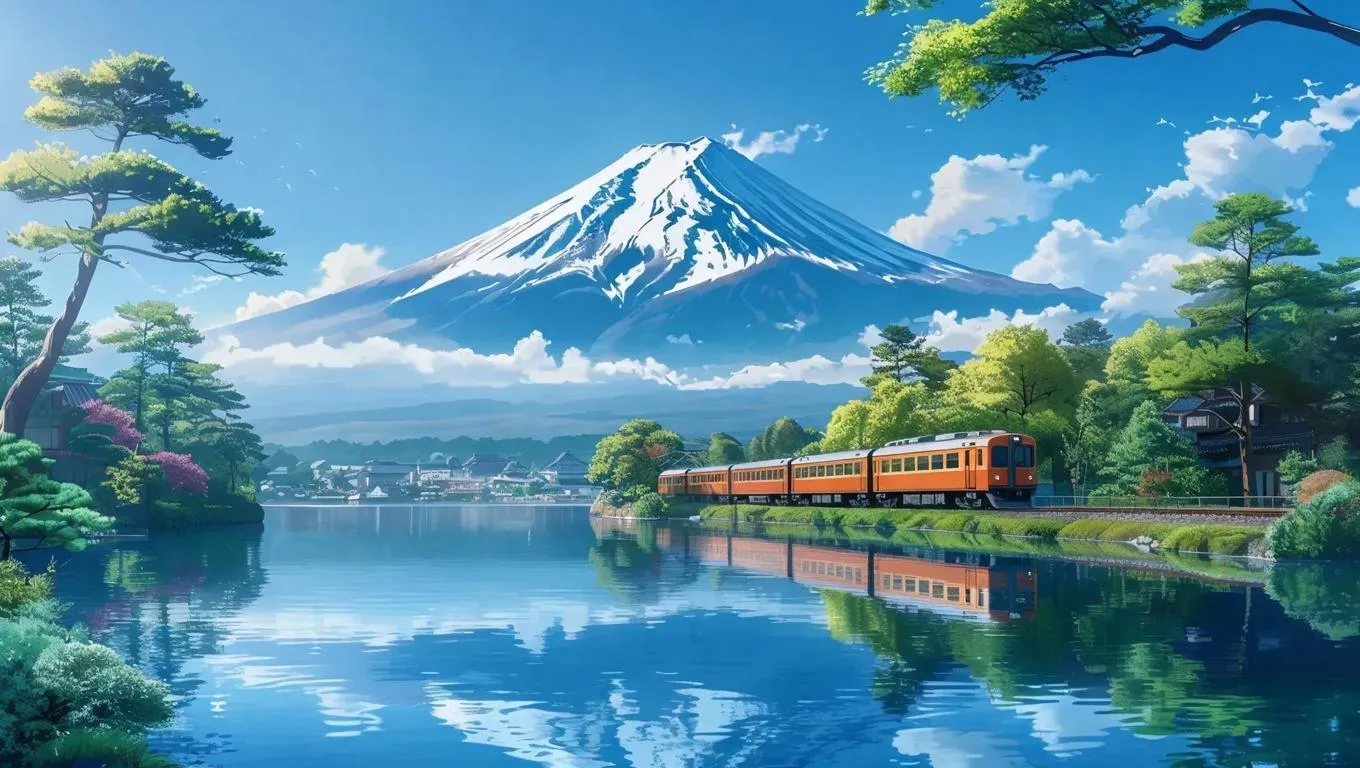Create vibrant anime-style images of Mount Fuji with a tranquil lake, charming train, and lush trees using AI. Perfect for anime enthusiasts and designers seeking dreamy, picturesque landscapes. Transform ideas into stunning visuals effortlessly with VivaGo.ai's advanced image generation tools.