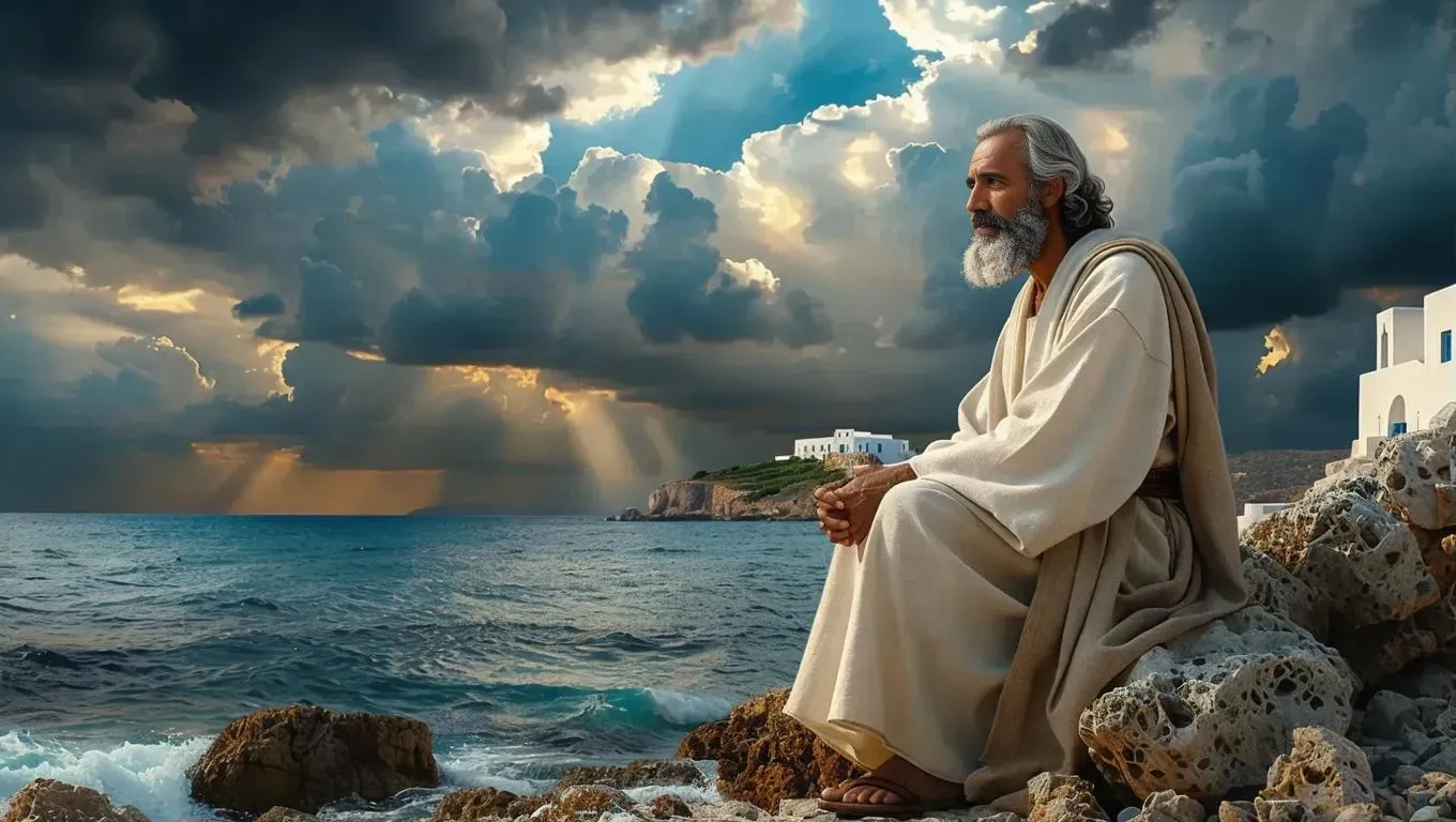 Generate an AI image of Apostle John on Patmos: elderly figure with white beard, wearing humble robes, seated on rocky shores under brooding skies. Captures contemplative exile, unwavering faith, and symbolic isolation through calm seas and vast horizons. Explore AI effects for evocative biblical storytelling and professional-grade visual artistry.