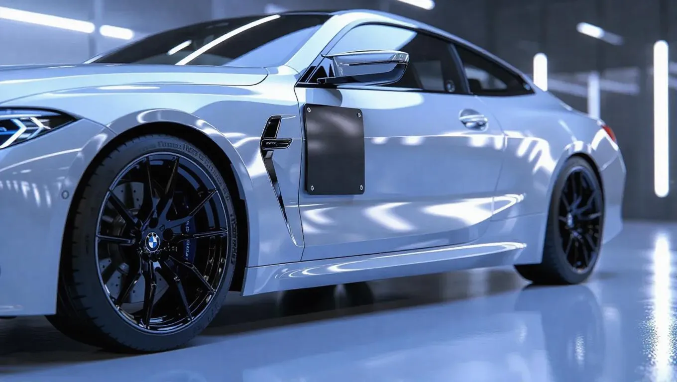 A highly detailed 3D rendering of a sleek white BMW car. The car's exterior has a glossy finish, reflecting ambient light. A magnetic plate is attached to the side of the car, appearing to stick firmly to the surface. The plate is in motion, sliding smoothly along the car's body, creating a dynamic visual effect. The scene is set in a modern, clean environment with soft lighting to highlight the car's contours and the movement of the magnetic plate. The style is photorealistic with attention to textures, shadows, and reflections.