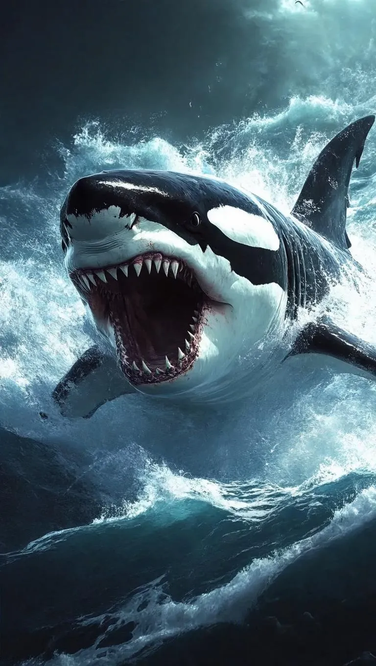 Create a dangerous AI-generated shark-orca hybrid battling underwater in 9:16 vertical format. Generate fierce marine predator fusions, dynamic ocean clash visuals, and hyper-realistic hybrid creature designs with vivago.ai's AI art tools for jaw-dropping aquatic warfare scenes.