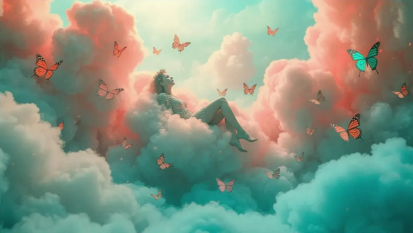 Suspended amidst an ethereal, cotton-candy-hued cloudscape, a lone, regal figure reclines on a wispy, cumulus throne, surrounded by fluttering, iridescent butterflies and a tangled, gossamer veil of cloud-strands, as turquoise and rose-hued mist swirls, curling around their majestic form, set against a brilliant, cerulean expanse, viewed through a dreamy, soft-focus lens, à la surrealismo fantascientifico.