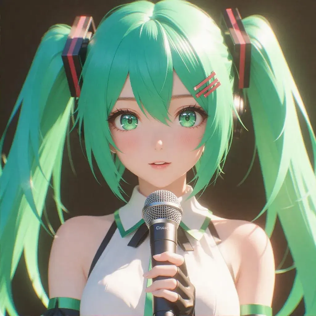 Generate a stunning 8K AI image of Hatsune Miku with vibrant green twin tails, wearing Hoshino Ai's iconic idol costume. This high-quality masterpiece features super-detailed visuals, stage-ready microphone, glowing penlight, and dynamic singing pose—perfect for anime fans and content creators seeking professional-grade AI-generated character art.