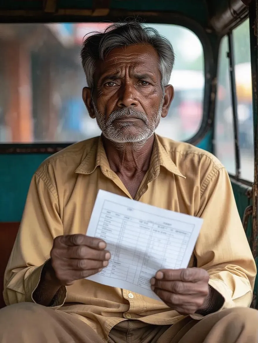 > A poor Indian auto-rickshaw driver, tired and sad, wearing simple worn-out clothes, holding a crumpled school fee receipt.