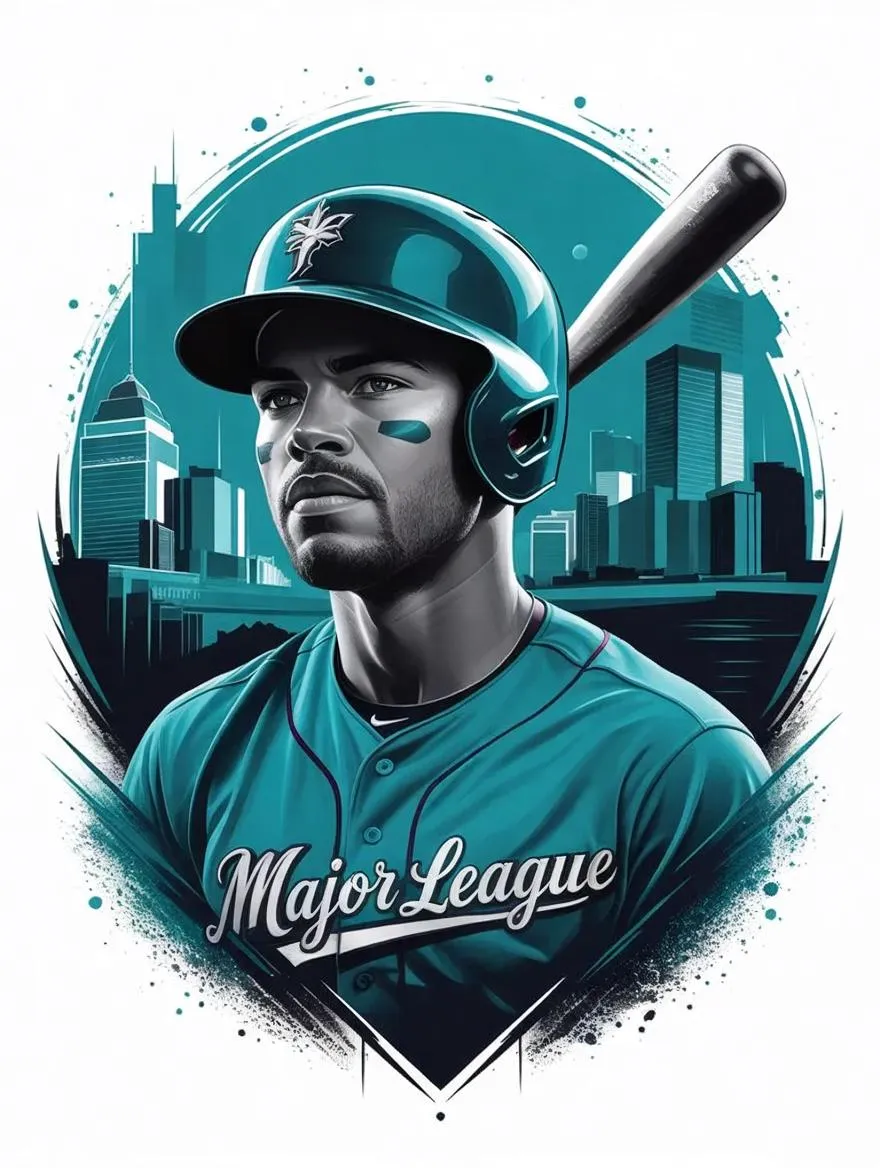 Create vibrant MLB graphic t-shirts with AI-generated Material Design. Features turquoise accents, neon cityscapes, and artistic despair themes on a crisp white background. Perfect for standout apparel. Explore vivago.ai's AI tools for professional-grade custom prints and editing.