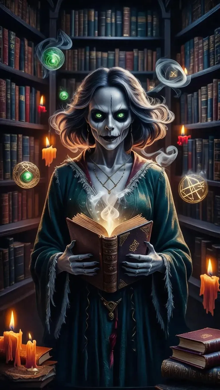 Discover an AI-generated mystic librarian with glowing purple hair, ethereal red, green, or golden eyes, and floating cursed tomes. This spectral scholar combines eerie magic and ancient wisdom, surrounded by orbiting runes and ghostly ambiance. Ideal for mystical, haunting themes in storytelling, gaming, or supernatural art. Unleash AI creativity for spellbinding characters and enchanted settings.