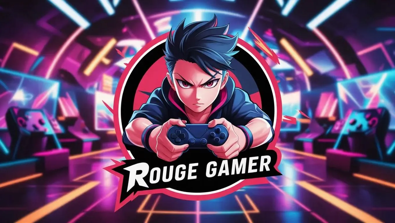 Anime-styled Rouge Gamer logo, featuring a bold, edgy, and dynamic anime character. The character, embodying the spirit of Rouge Gamer, is depicted in a high-action pose, holding a gaming controller with a determined expression. The background is a neon-lit gaming arena, filled with futuristic elements and a vibrant color palette, reflecting the energy and excitement of gaming. The text "Rouge Gamer" is prominently displayed in a stylized font, adding a professional touch to the overall design.