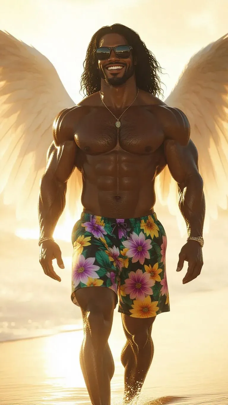 Generate a hyper-realistic 4K celestial beach scene with a powerful, laid-back archangel in floral surf shorts and Ray-Bans. Ethereal glow, serene waves, divine sunset, and majestic white wings. Transform text into stunning visuals with VivaGo.ai's AI image generator for heavenly, vibrant, and detailed angelic surfer artwork.