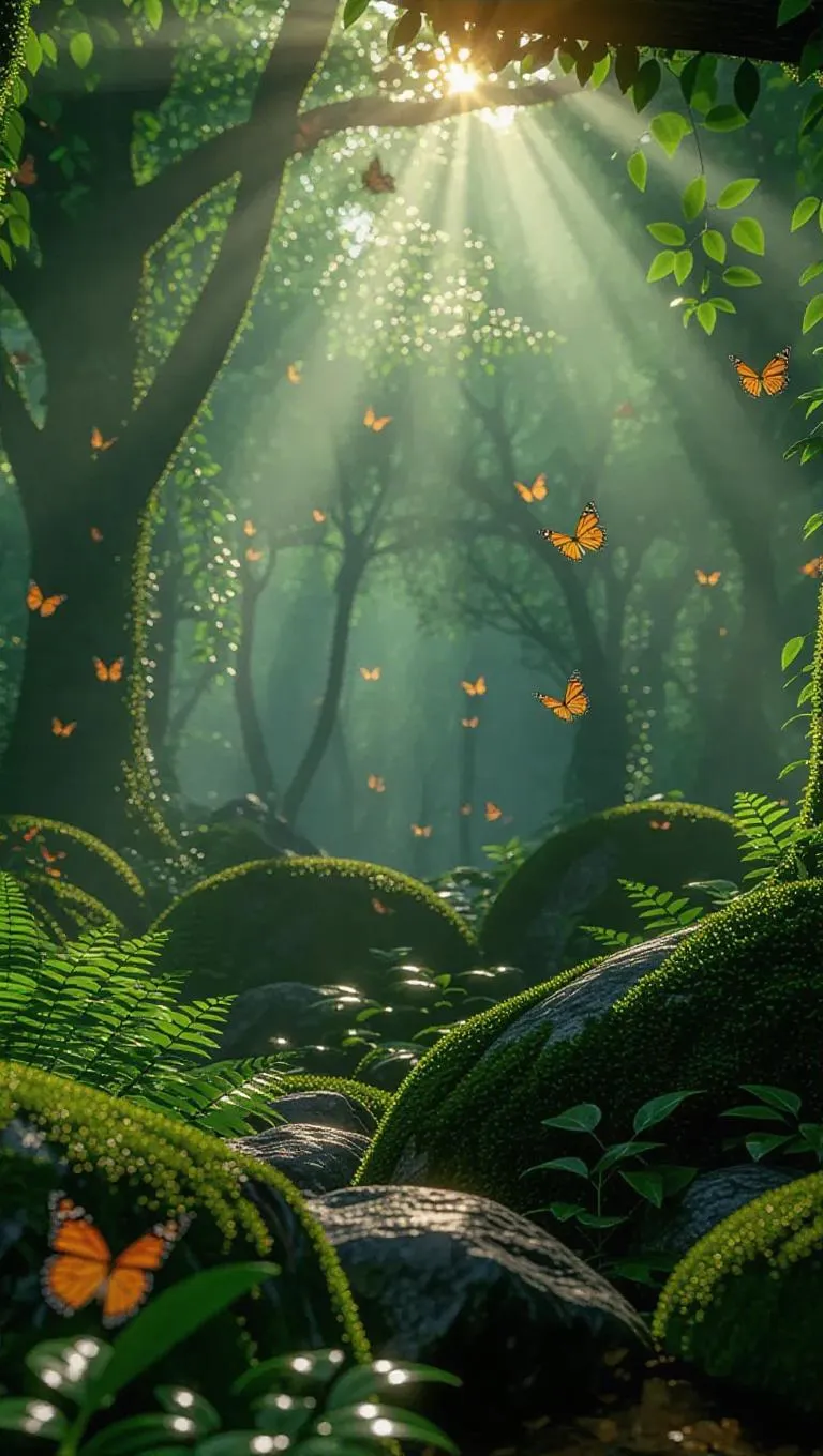 Create a serene AI-generated forest wallpaper with vibrant dawn sunlight, dew-kissed leaves, and fluttering butterflies. Ultra-detailed 8K resolution, lifelike textures, and gentle animation bring tranquil nature scenes to life. Perfect for dynamic wallpapers, blending realism and artistry for immersive digital displays. Ideal for vibrant, calming visuals with professional-grade AI effects.