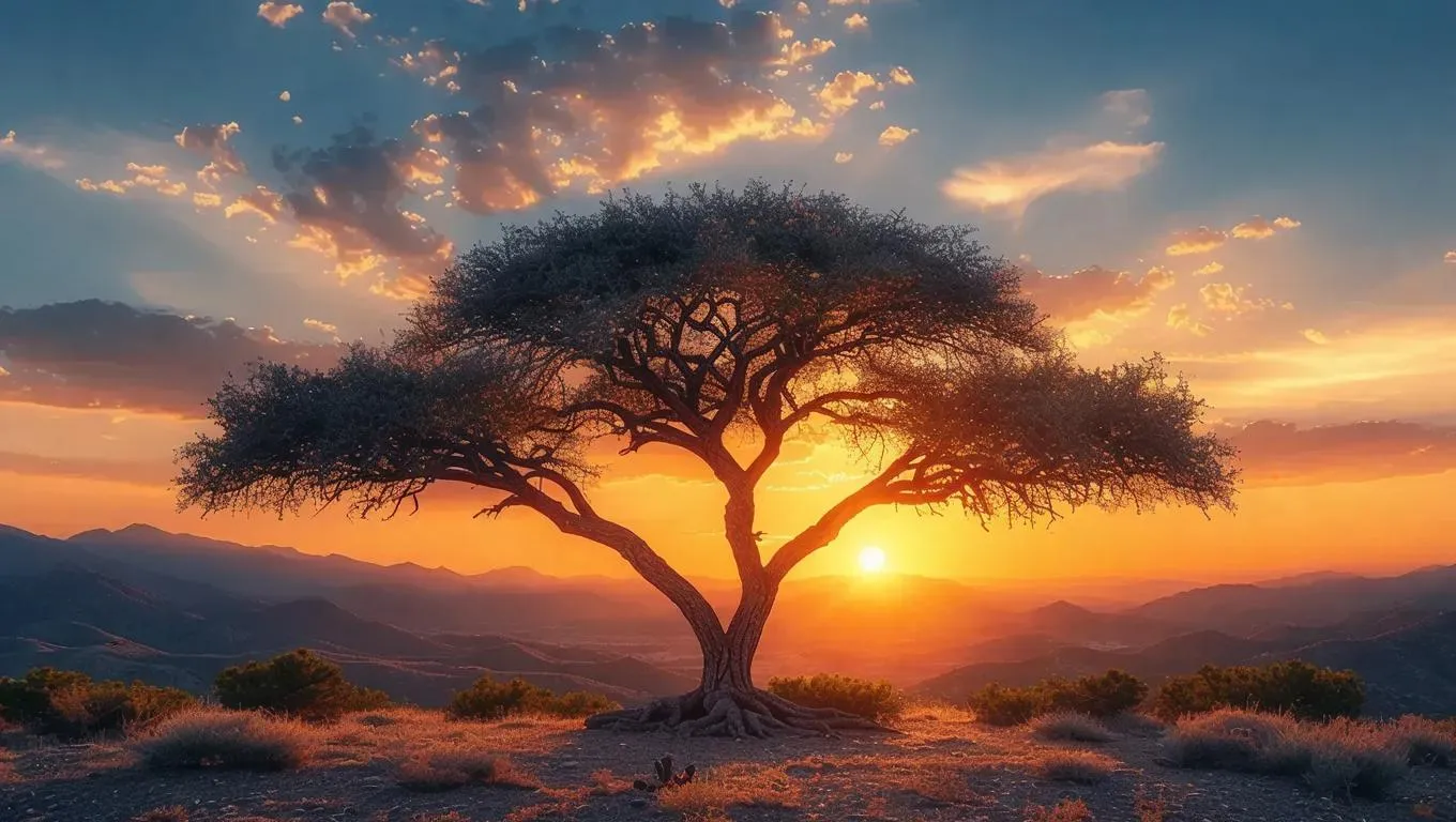 Serene minimalist plant wallpaper featuring a sunset-inspired tree branch with intricate dark patterns against warm western mountain skies. This captivating design blends tranquil sunset hues and bold branch contrasts, creating calming, elegant decor to elevate any space effortlessly. Perfect for harmonious, visually striking interiors.